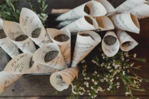Cones fashioned from music paper and filled with dried lavender seeds are an eco-friendly and fragrant detail for guests to toss over the newlyweds.