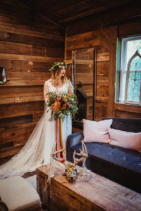 Bright florals, warm hues, and sweet treats inspired this bohemian styled shoot at the beautiful Fields Reserve. This bride, adorned with florals designed by Simply Glamorous Designs at Oregon Floral, looked stunning in her lacey, long-sleeved dress from Vera’s House of Bridals. Sugarsmith‘s equally adorable and delicious cotton candy was a perfect dessert to top it all off! Keep reading to see more beautiful and tasty details from this unique styled shoot.