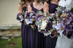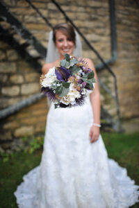 DESCRIBE YOUR WEDDING FLOWERS: Our florist and family friend, LuAnn, did an amazing job of capturing our personal style and keeping the flowers budget friendly. All we had given her was the theme of our wedding and let her work her magic from there. Once we decided to go with artificial flowers, it was style that was most important. Simply elegant, what better way to reach that than calla lilly, hydrangeas, seasonal mums, ranunculus in complimentary plums with a splash of ivory and gray. Seedlings, eucalyptus, and thistle were added for texture and dimension making you second guess if they were real or artificial. The traditional nosegay style with wrist corsages and boutonni�re accommodated all the wedding party and family. The bridal bouquet was personalized with keepsakes passed down from grandmother to mother to bride. Not only being budget friendly but the convenience of going with artificial made for a stress-free day. Many of the memories of our wedding day will always be remembered by the color palette, simplicity, and character achieved by embodying our own personal style. It is also wonderful to still have all of our flowers on display in our home.