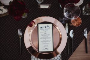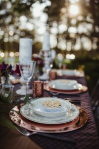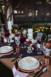 copper chargers, copper plates, mini pies, table setting, table settings