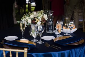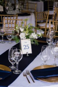 DID YOU USE ANY SPECIALTY TABLES, CHAIRS, LINENS OR DINNERWARE? Everything was from Event Essentials. Loved the gold chargers we picked!