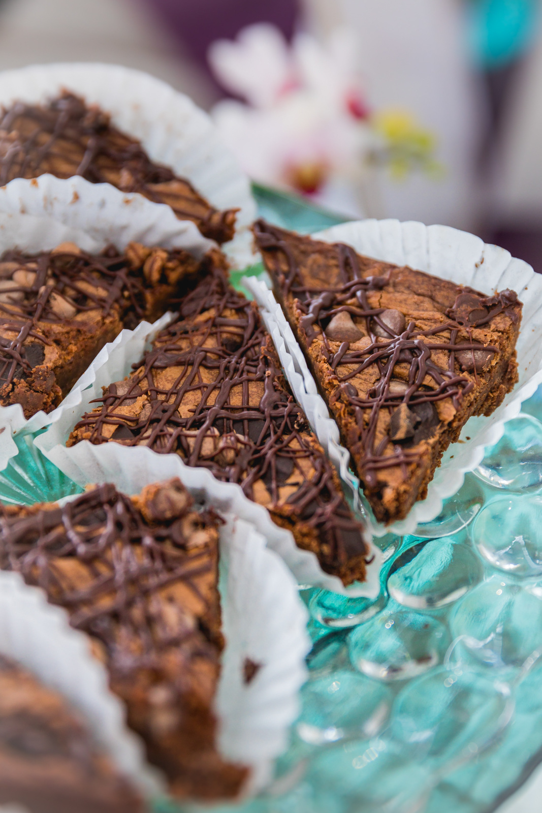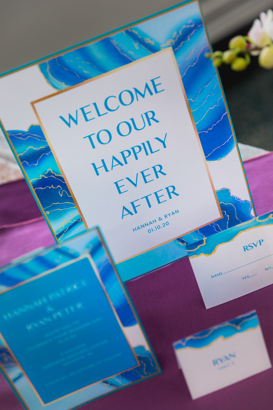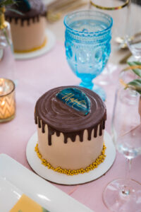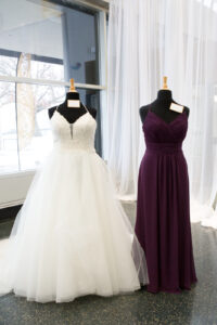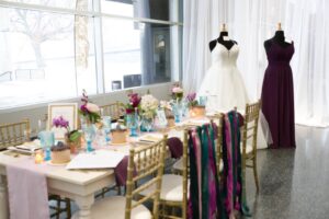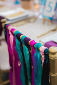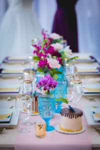 A beautiful A-line dress with a pop of deep purple for the bridesmaids from Brides N’ Belles is perfect for this sparkling and colorful design.