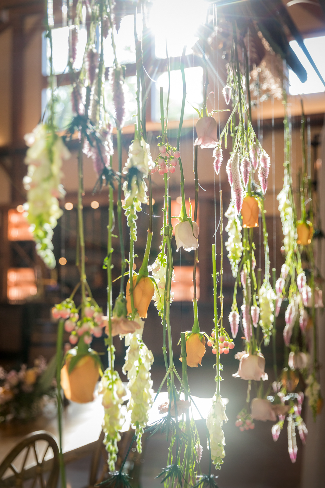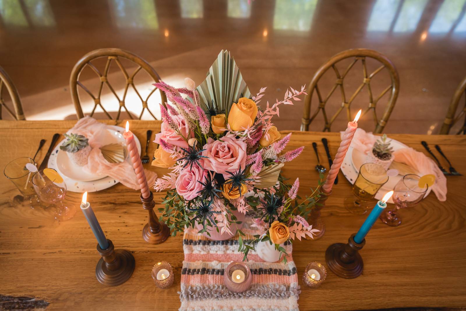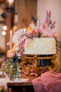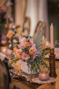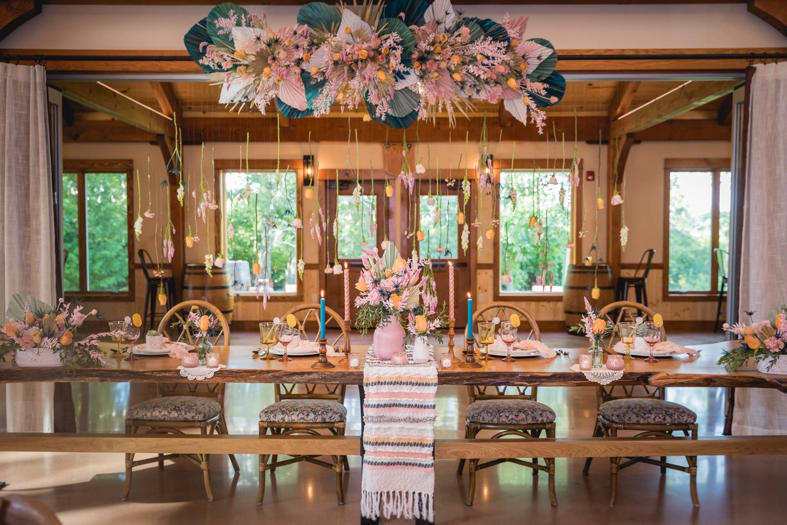 An eye-catching hanging floral installation with floating blooms makes a statement above a rustic head table, bringing color, texture, and dimension to this reception look from Melody Rose Designs. Along with their assorted flower arrangements of vibrant fresh and dried florals, Melody Rose’s unique vintage, rustic, and boho rental pieces provide an eclectic mix of glassware and other decor items for this tablescape and throughout the remainder of this wedding design.