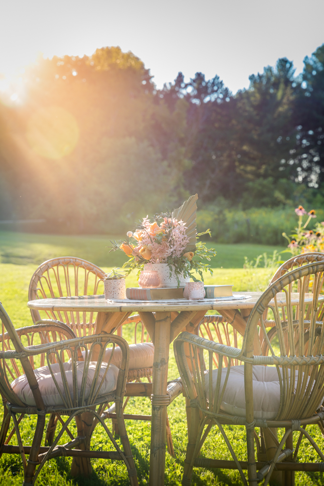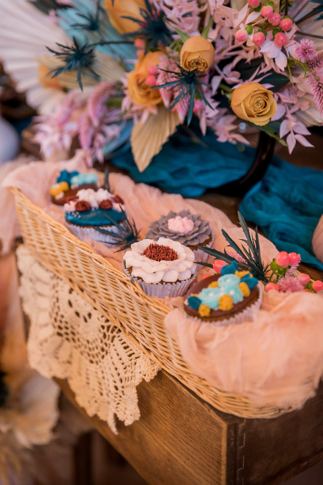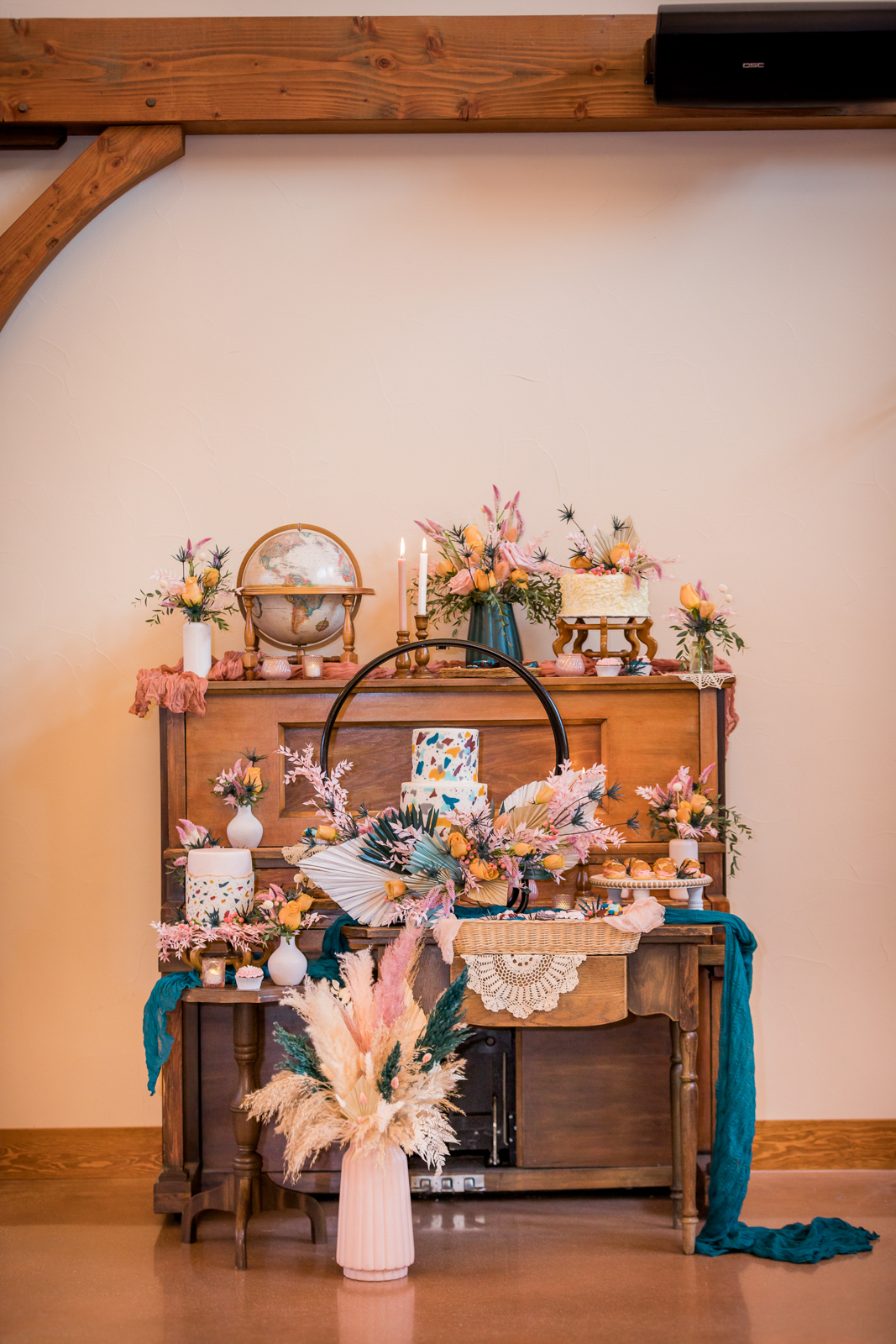 An eye-catching hanging floral installation with floating blooms makes a statement above a rustic head table, bringing color, texture, and dimension to this reception look from Melody Rose Designs. Along with their assorted flower arrangements of vibrant fresh and dried florals, Melody Rose’s unique vintage, rustic, and boho rental pieces provide an eclectic mix of glassware and other decor items for this tablescape and throughout the remainder of this wedding design.
