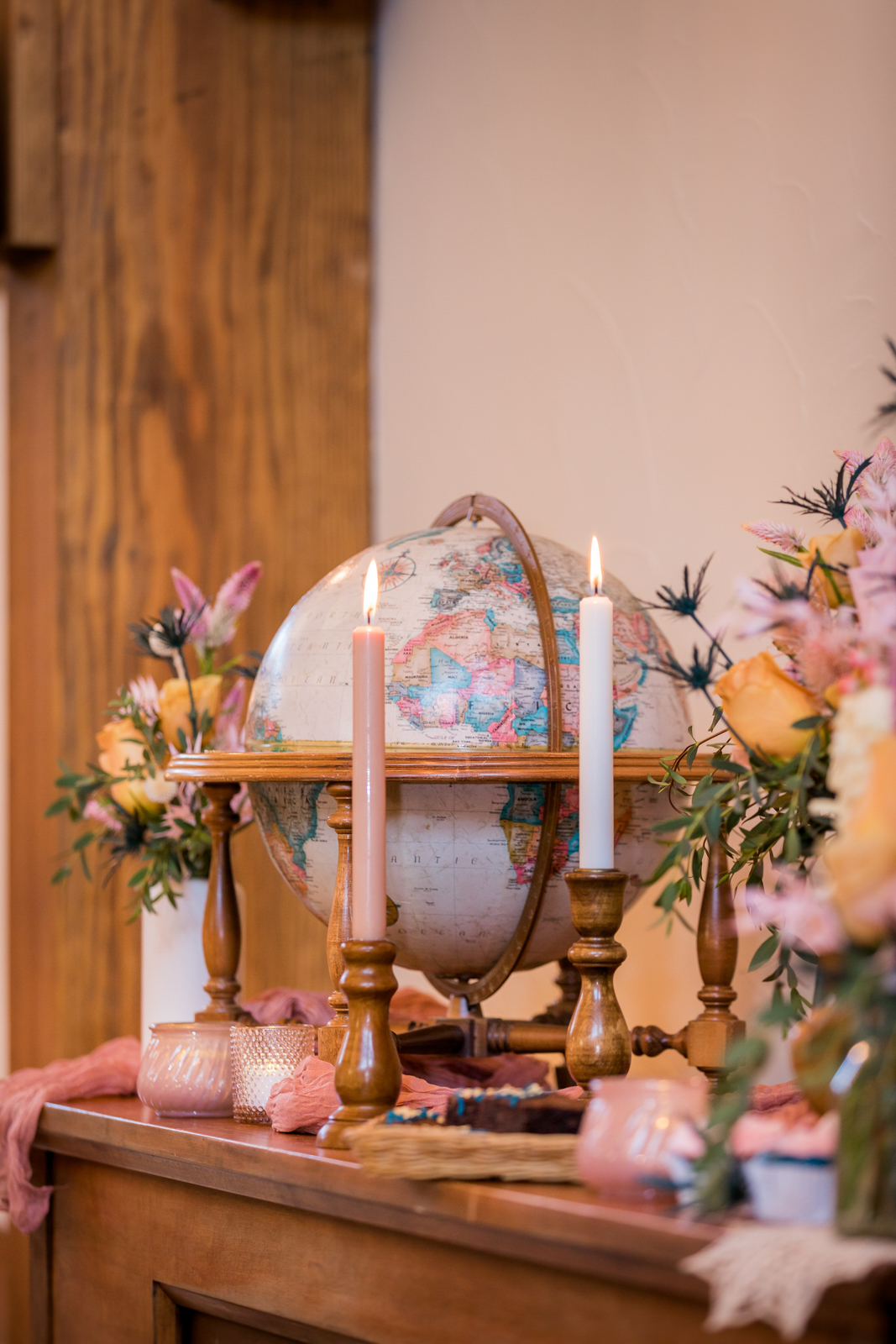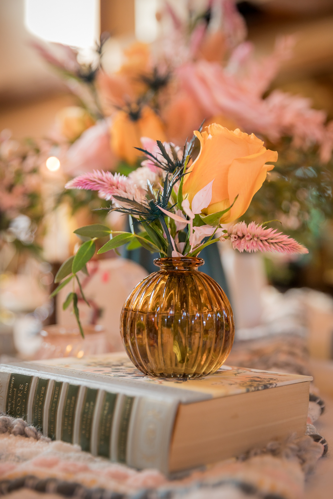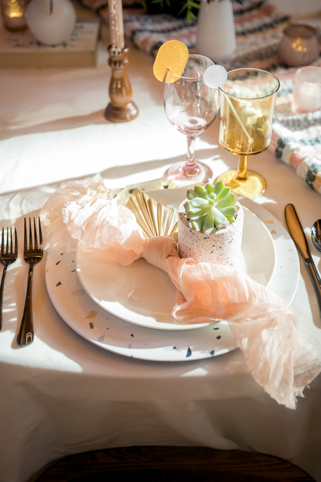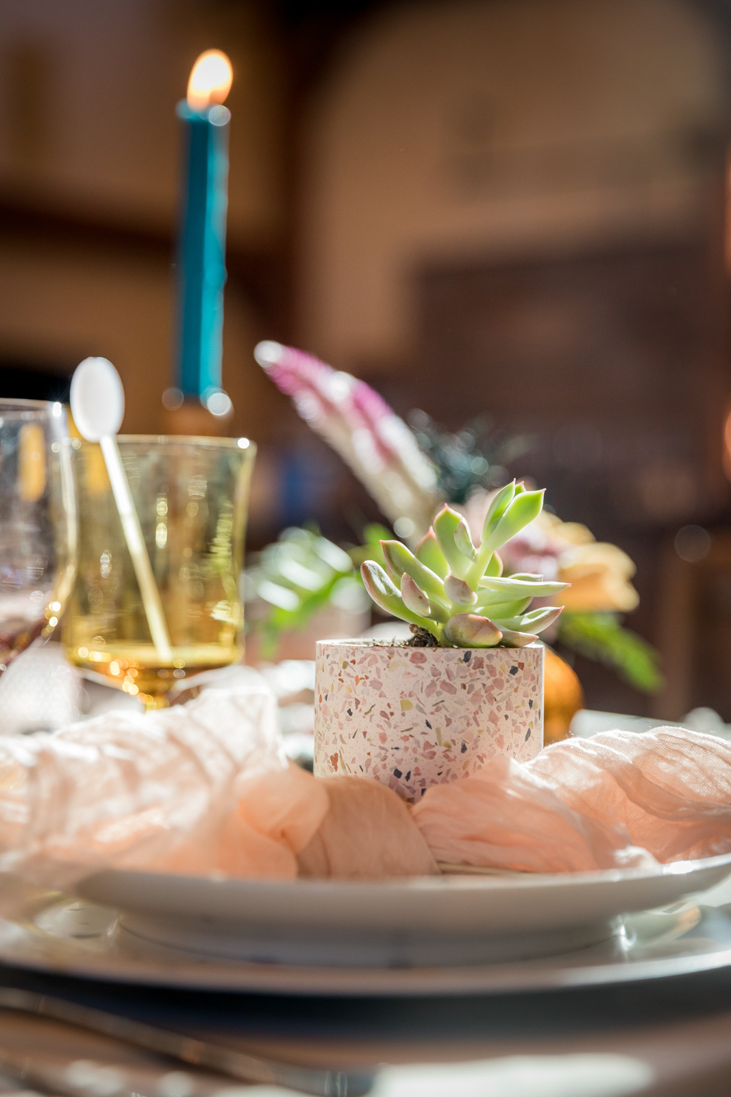 Terrazzo-patterned charger plates and succulent favors inspire a dreamy, colorful table setting accented with vintage books, taper candles, blush cheesecloth napkins, and, of course, stunning florals.