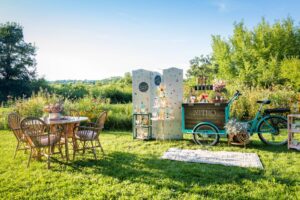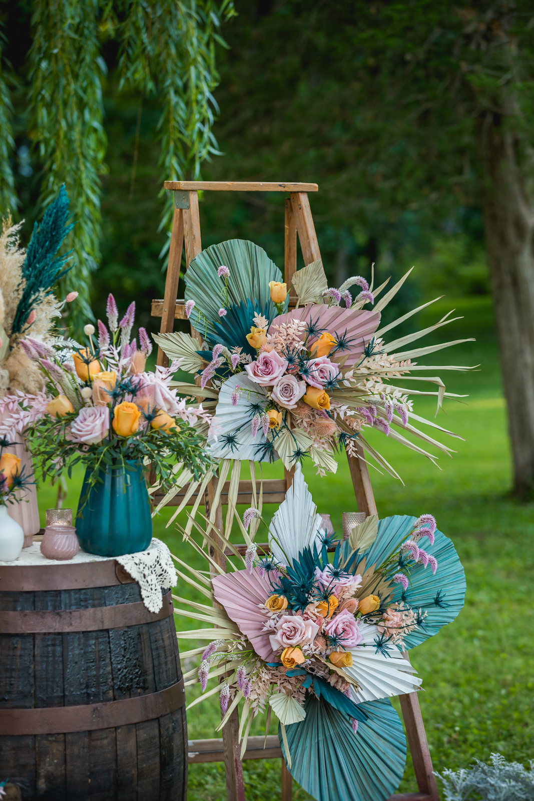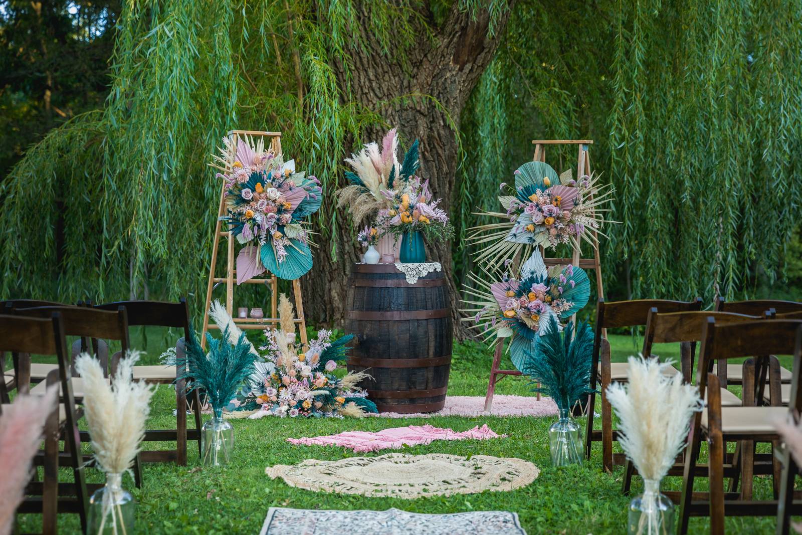 Rustic meets boho with a bit of whimsy in this unique and impactful ceremony scene and backdrop curated by Melody Rose Designs underneath the beautiful weeping willow tree on Barnwood Events’ gorgeous outdoor grounds.