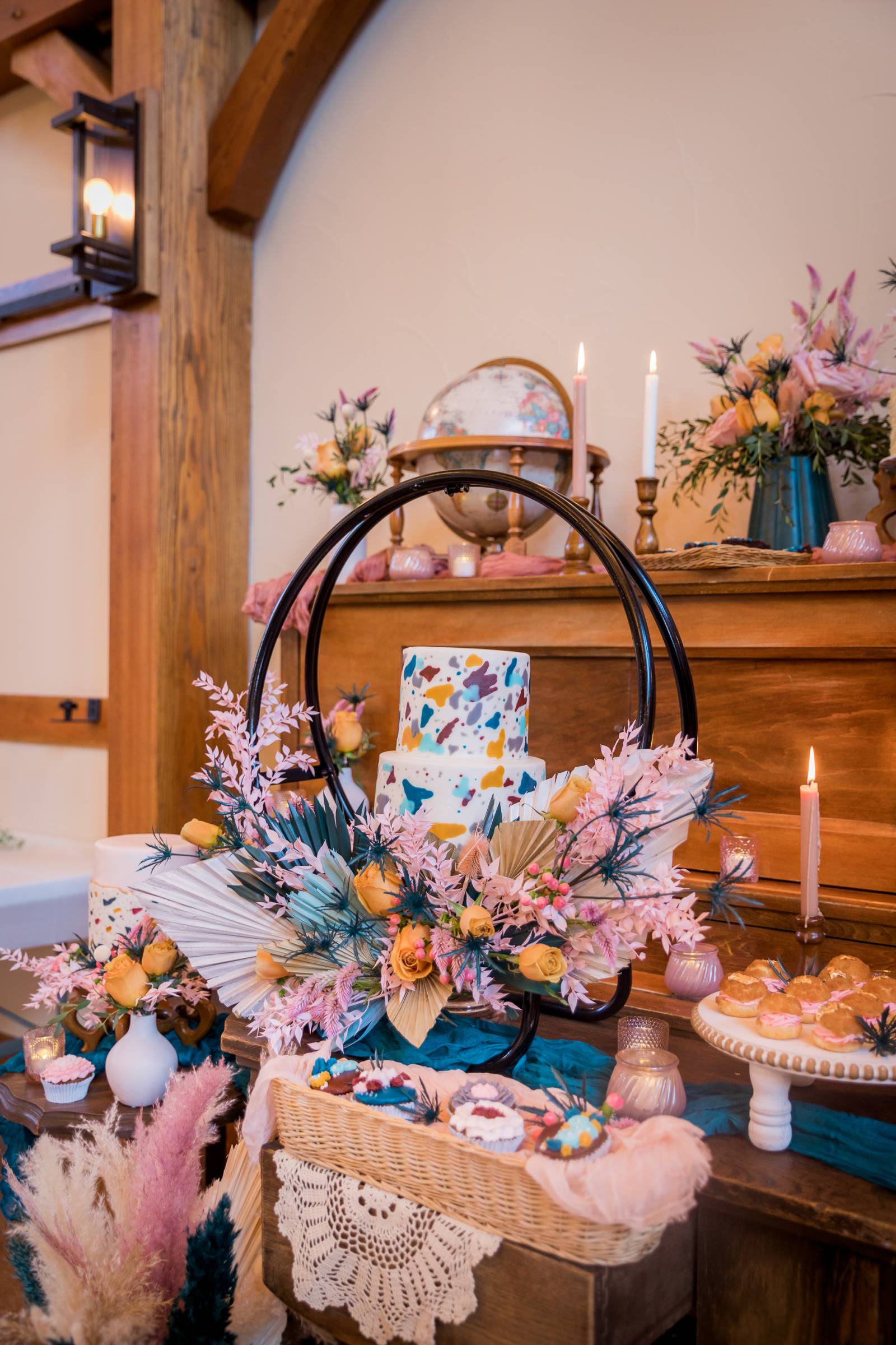 Creatively designed cakes and desserts from Craig’s Cake Shop shine in this eclectic display of treats, from their detailed Terrazzo-inspired cakes to their signature whipped frosting with white chocolate shavings cake to gold-flecked mini cream puffs, cupcakes, and more!