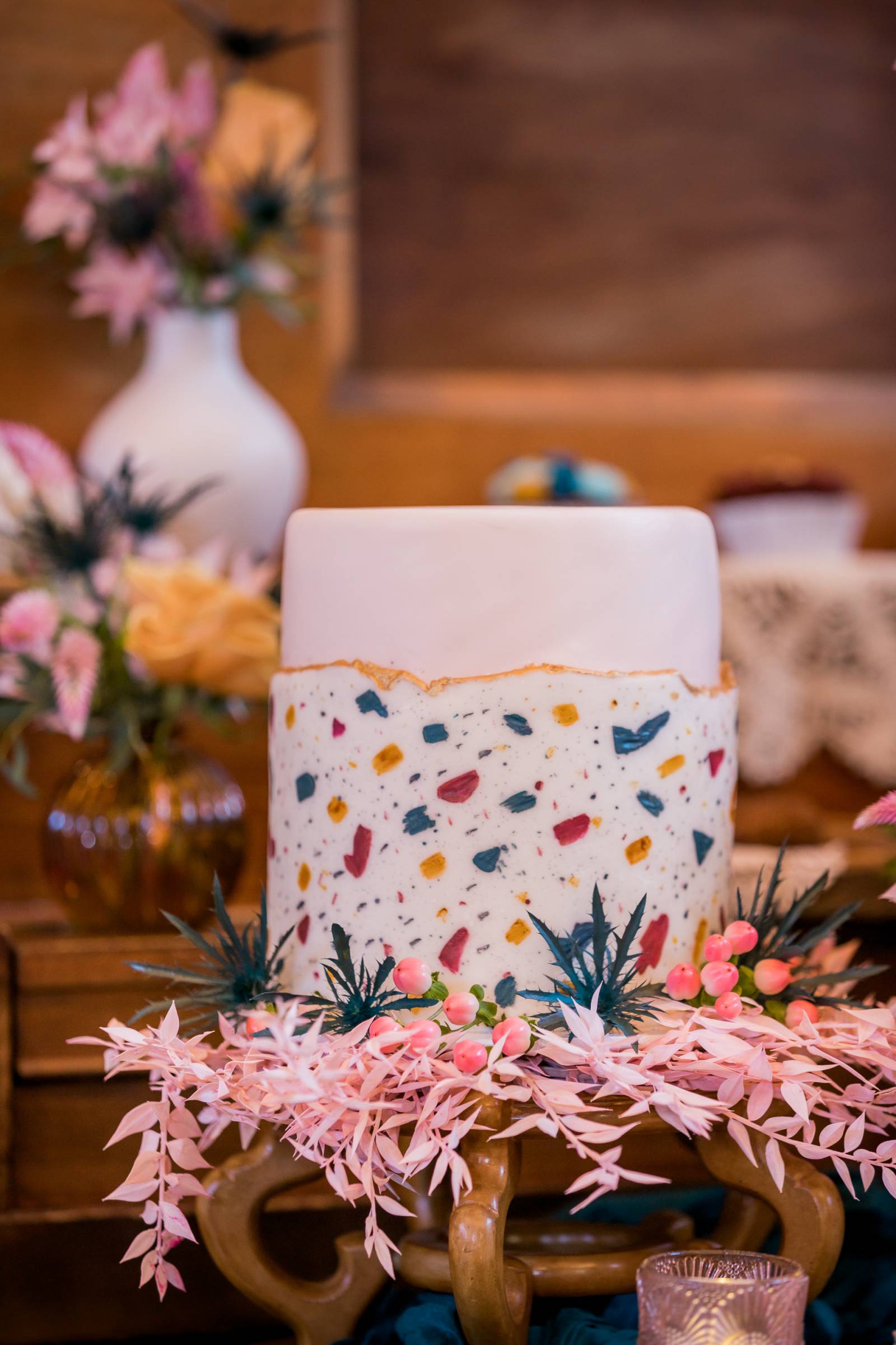 Inspired by the splashes of color and unique shapes that the speckled Italian-style terrazzo pattern brings, Sarah from Melody Rose Designs created a playful and eclectic wedding look at Barnwood Events in Madison, Wisconsin! Full of impactful florals, diverse textures, and sweet pink, yellow, and blue hues, this boho barn wedding with a twist shows couples how to color outside the lines when dreaming up their special day and show off their unique personality with the right vendor team. In collaboration with Craig’s Cake Shop, The Nitro Bike, and LK Bridal Studio, captured by The Wedding Flashers, get inspired by all the quirky details this shoot brings below!