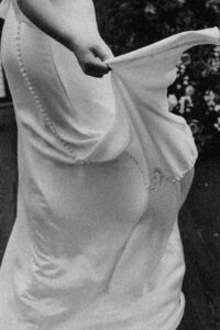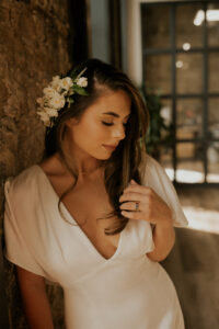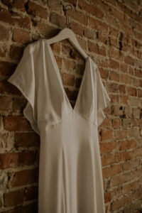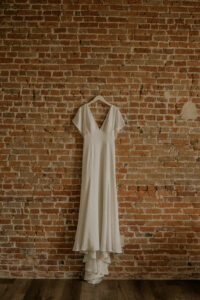 Miss Ruby’s Bridal Boutique provided the perfect vintage-inspired satin gown with a sexy deep v-neck, flutter sleeves, and elegant buttons starting from the low back to the very end of the dress’ flowing train.