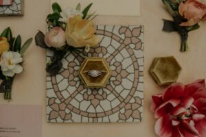 Uncovered in renovations of Ellsworth Block’s historic venue, these gorgeous light pink tiles from 1901 made their feature both in styling and serving as inspiration for the stunning vellum tile-like stationery design created by Sprout Studio.