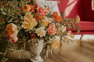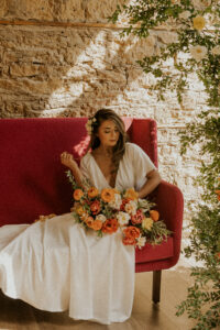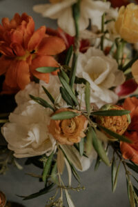 This styled shoot was inspired by the beautiful flowers that spring yields, and with Lisa at Sunborn Gardens’ unparalleled eye, creativity, and flower farm full of bright seasonal blooms, this wedding look came to life. Colorful tulips, daffodils, and ranunculus varieties combined to produce lush, elegant, and vibrant statement floral arrangements throughout the design.