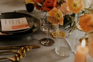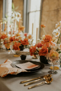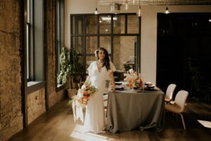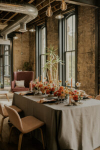 Modern dinnerware and flatware from Rosewood Wed paired alongside vintage elements like brass candlestick holders and restored tiles perfectly complement Ellsworth Block’s renovated 1871 venue. This downtown Madison space located on Capitol Square combines updated modern industrial finishes with its original architecture, beautifully blending the old and the new.