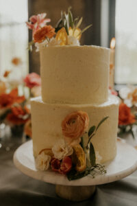 A creamy, luxurious two-tiered cake from Nectar Bakery adorned with florals and bursts of dried citrus is the perfect sweet addition to this dreamy tablescape.