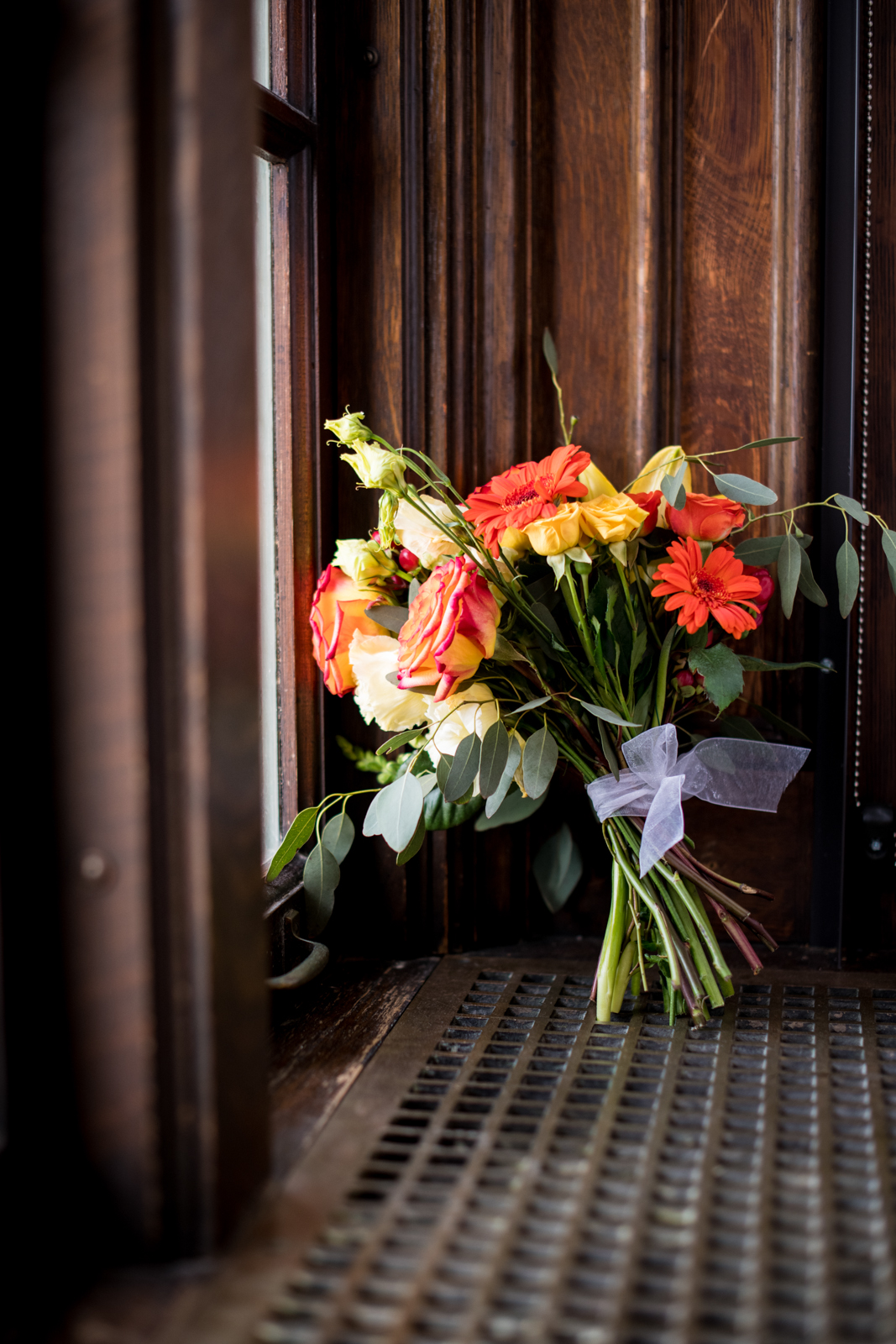 DESCRIBE YOUR WEDDING FLOWERS: Bright and colorful with yellow, red, and orange.