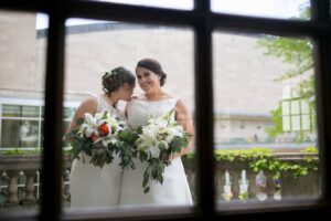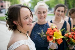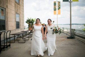 Krista and Betsy’s special day was full of color and true Madison flare. Captured stunningly by Maureen Cassidy Photography, this wedding was bright, personal, and even included a visit from Bucky the Badger, himself! Read on to see more from this Wisconsin wedding featuring some of our wonderful vendors such as Vera’s House of Bridals and Carl’s Cakes and Market Street Catering.