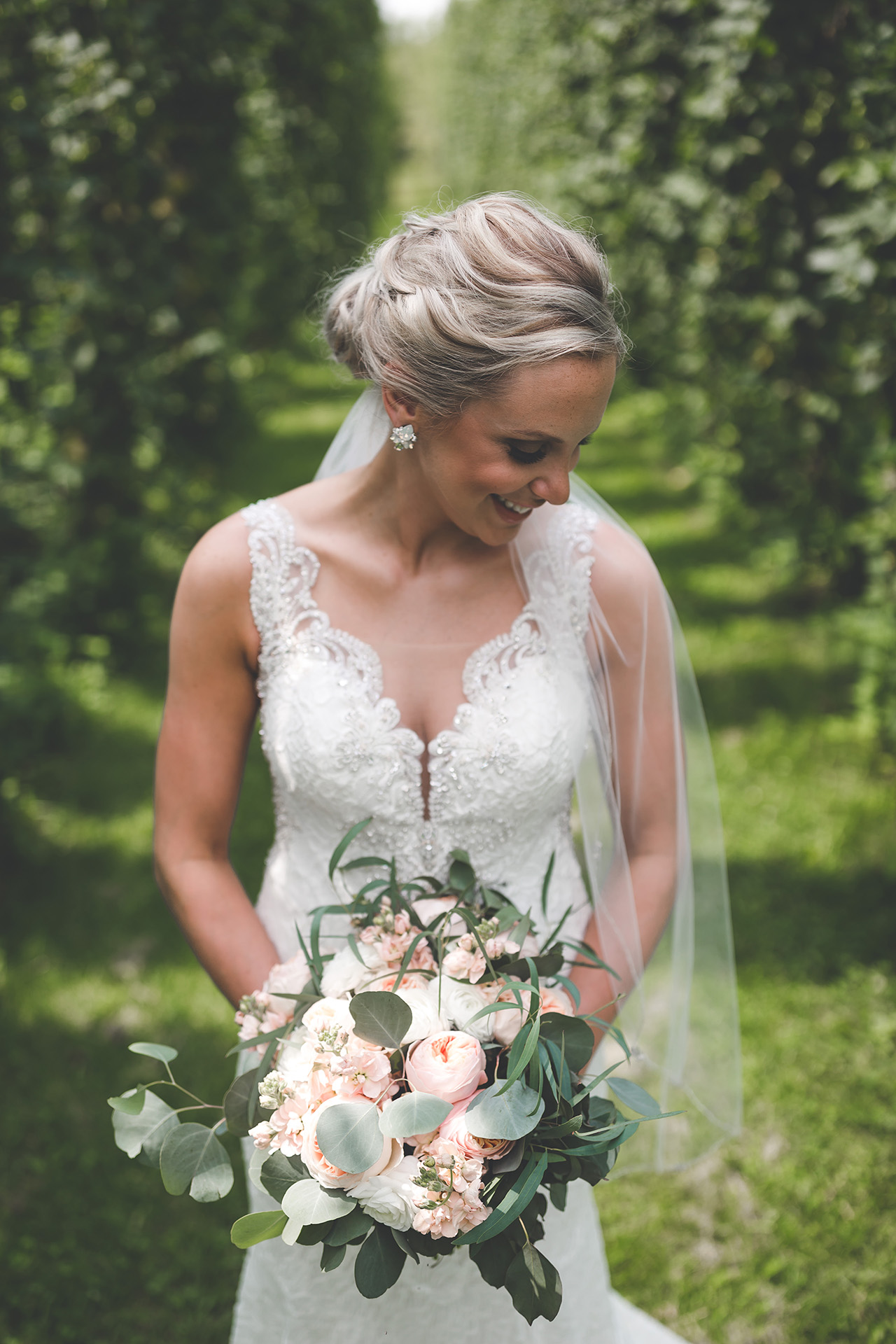 DESCRIBE YOUR WEDDING FLOWERS: We had greenery on the tables and in our bouquets along with soft peach and white in my bridal bouquet.