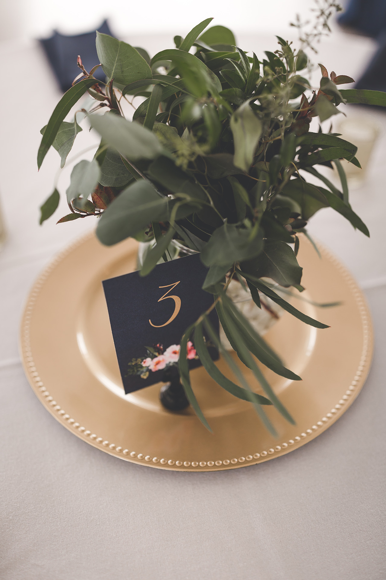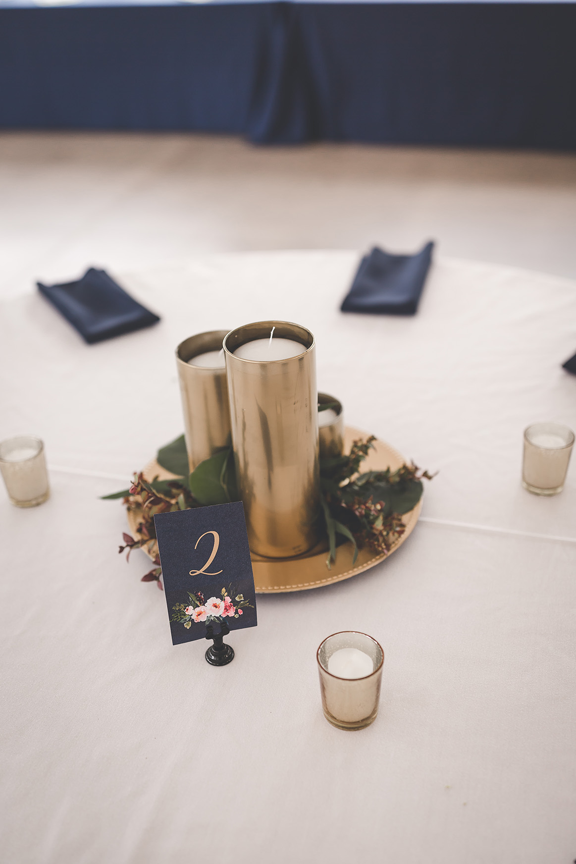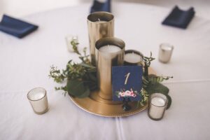 gold navy blue candle greenery centerpieces