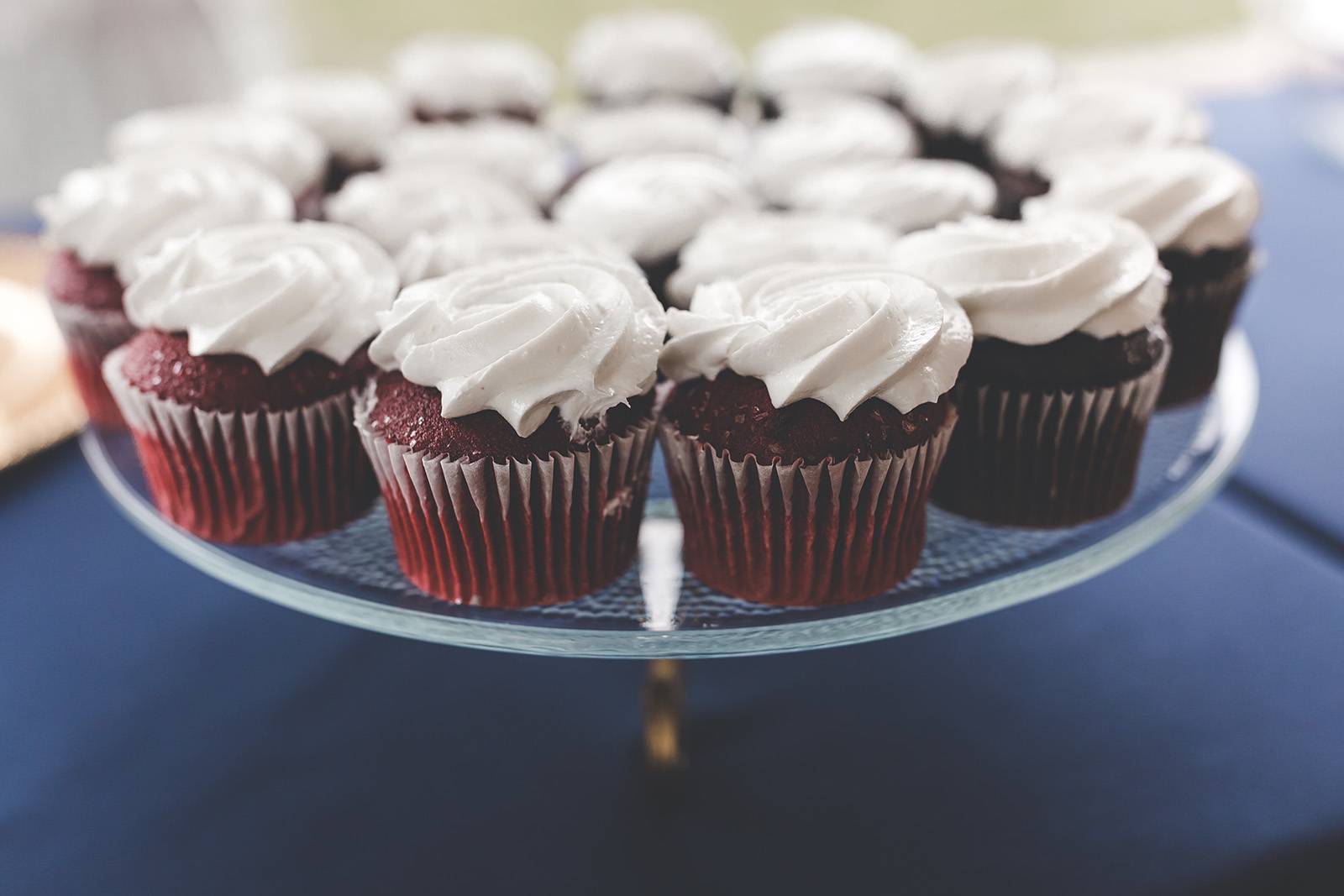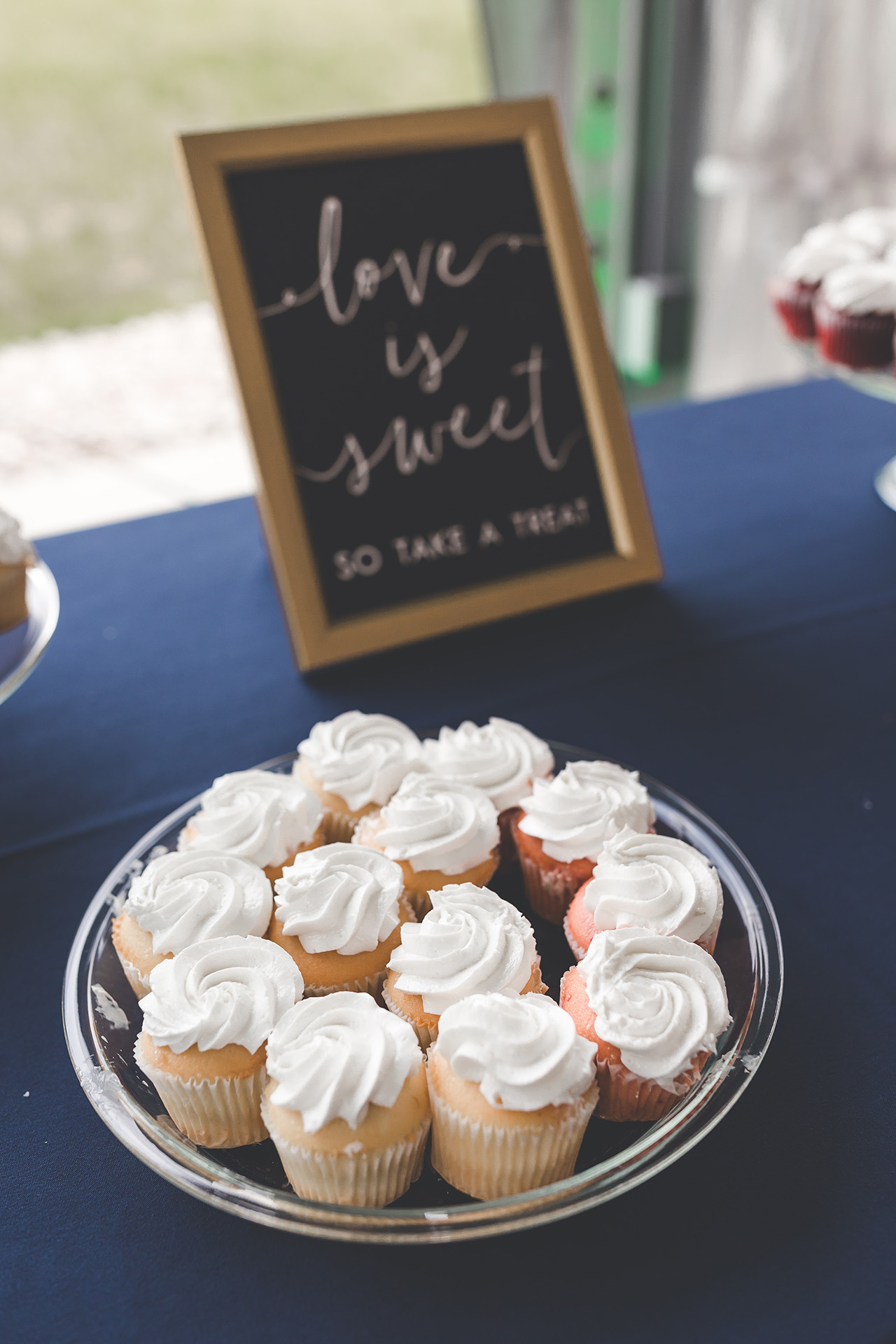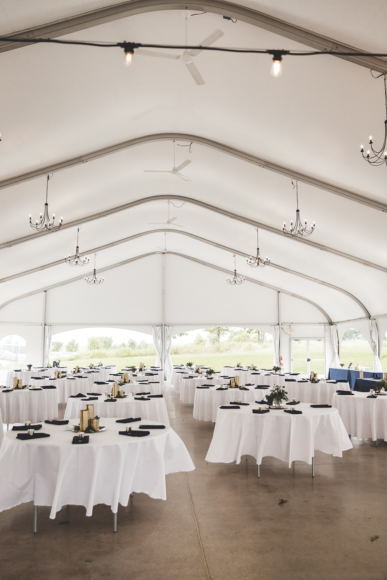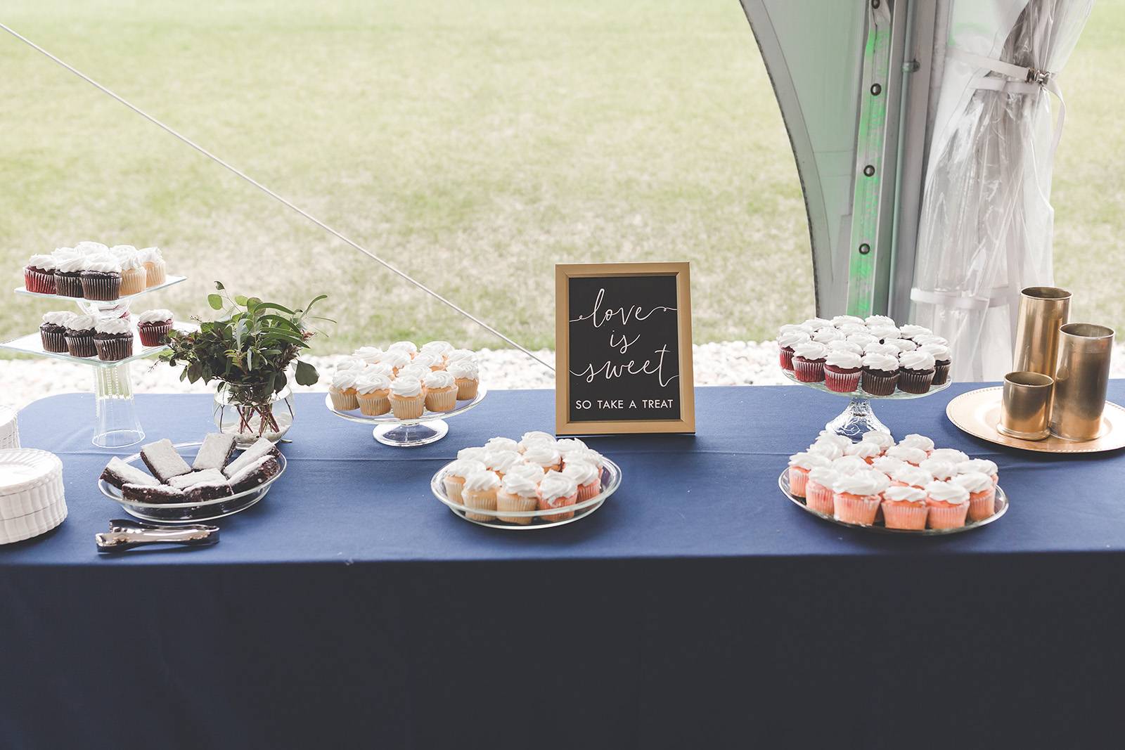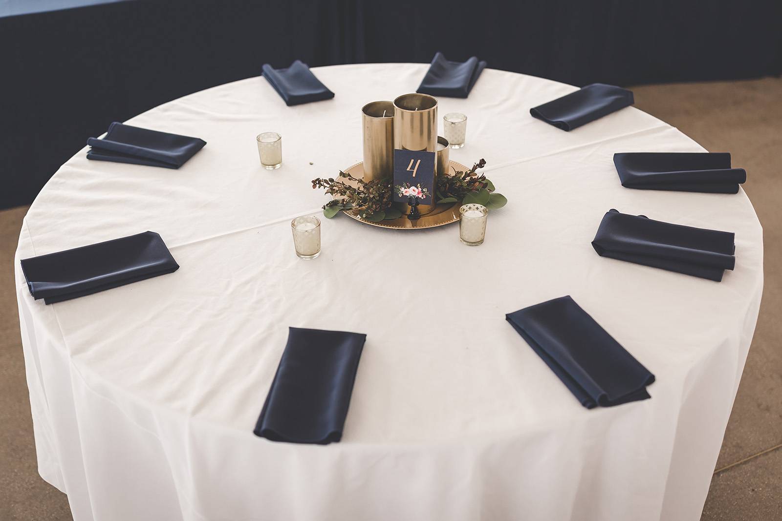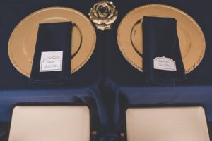 DID YOU INCORPORATE ANY SPECIALTY TABLES, CHAIRS, LINENS OR DINNERWARE? We rented navy tablecloths for our gift/guestbook/dessert/cocktail tables with sequin gold runners and gold table ties.