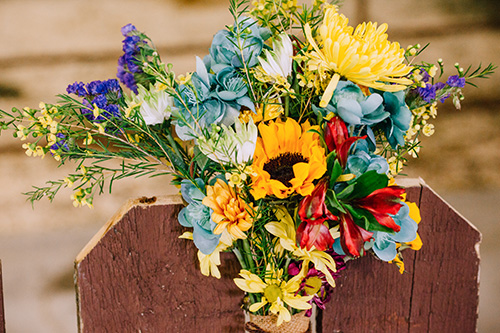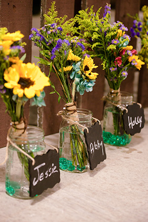 DESCRIBE YOUR WEDDING FLOWERS: Our flowers were very special as my step mom’s sister did every arrangement and bouquet. It was a country array of flowers that were not over done but smelled wonderful. We also had wheat boutonnieres with a touch of teal to tie the groomsmen’s and groom’s shirts in. My step mom also bought mums to be set up around our ceremony for an extra touch of color with our western d�cor.