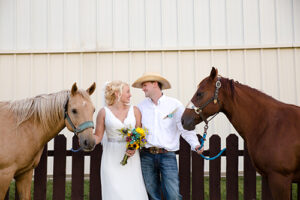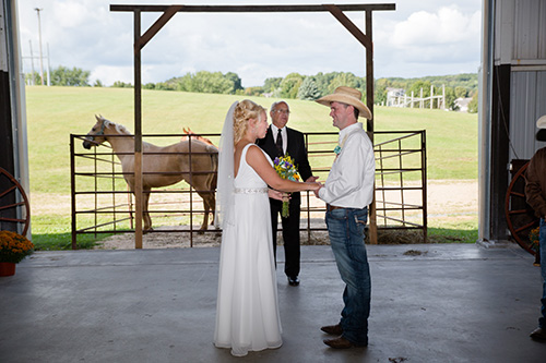 You sure don’t need to live in Wyoming or Montana to have a beautiful country western wedding. All you need are a great pair of cowboy boots, a cowboy hat, horseshoes and two of the most beautiful horses ever. When Morgan and Terrence’s original venue fell through only TWO days before their wedding because it got washed out by heavy rainfalls, they luckily found this alternative location at the RACA Ice Rink in Reedsburg. Which I have to admit, some things just work out as they should because this was the most stunning backdrop with rich greenery and wooded trees.