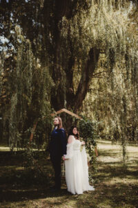 Bridgette & James’ outdoor ceremony was held under tall, shady trees and surrounded by the beauty of nature. Twig and Olive Photography captured stunning indoor and outdoor photos, with no shortage of backdrops to choose from. The bride wore a romantic, thinly strapped dress from Bon Bon Belle Boutique, with off-the-shoulder sleeves, a deep neckline, a flowing train, and glittery waist detailing that matched her hairpiece.