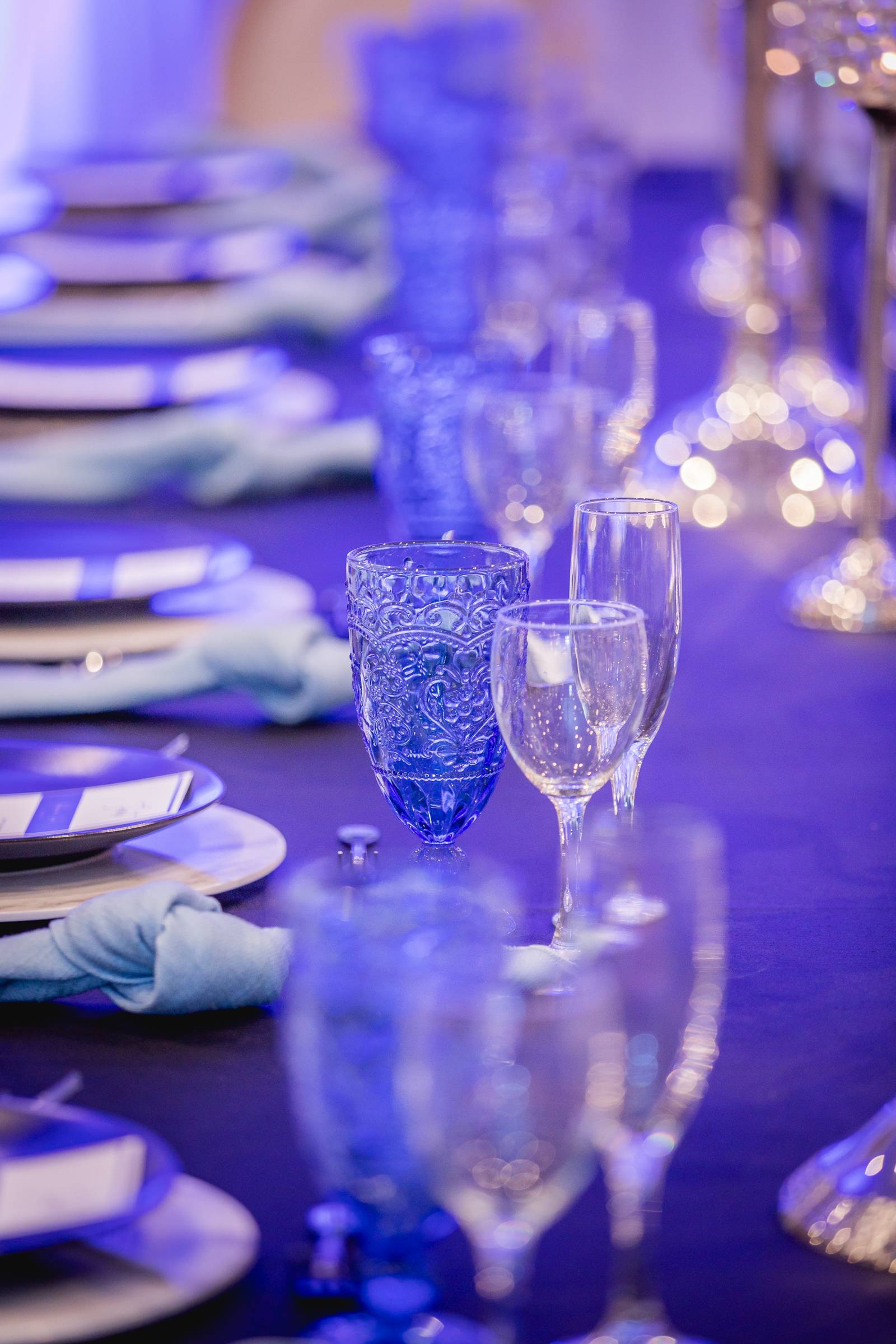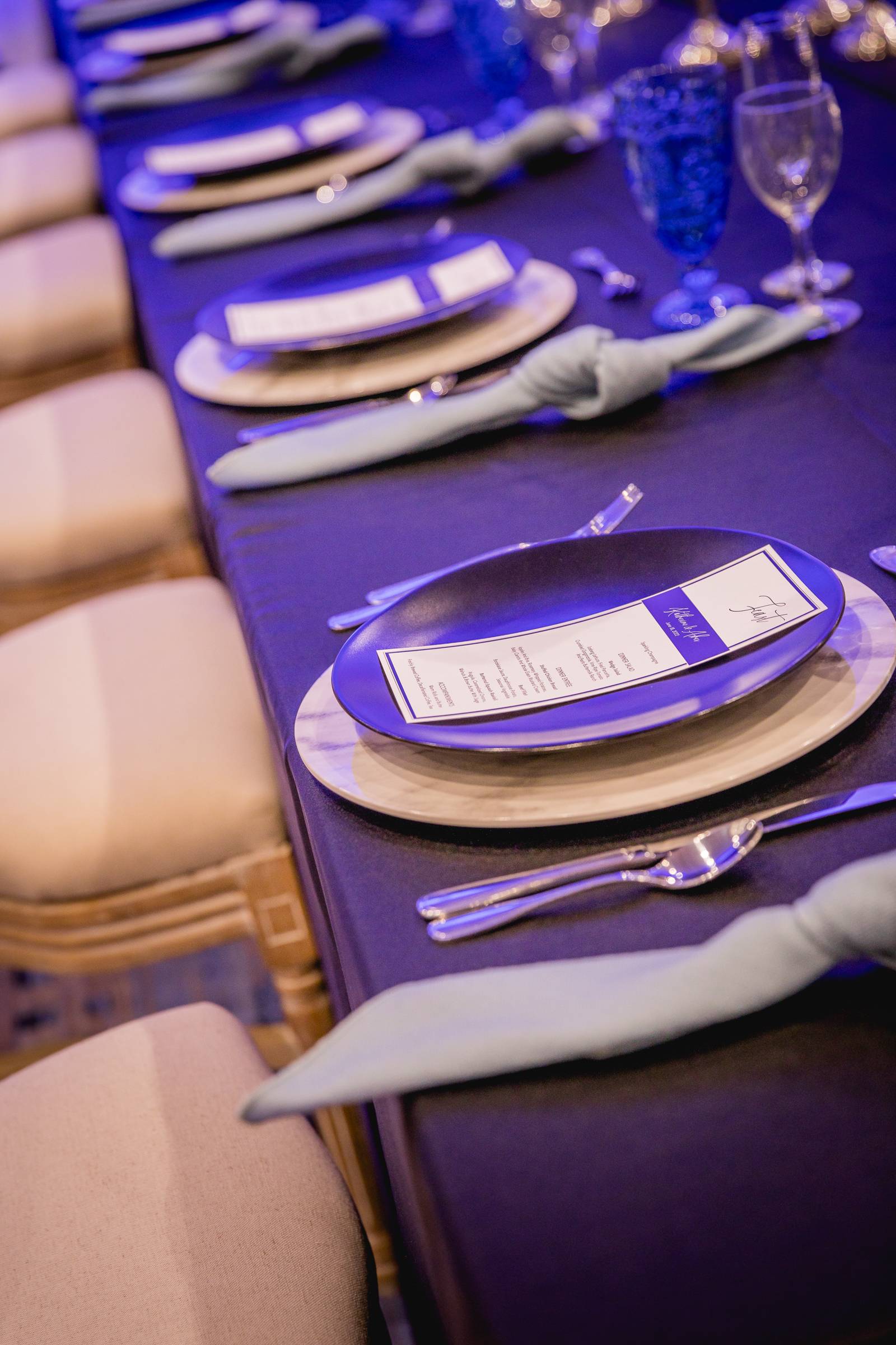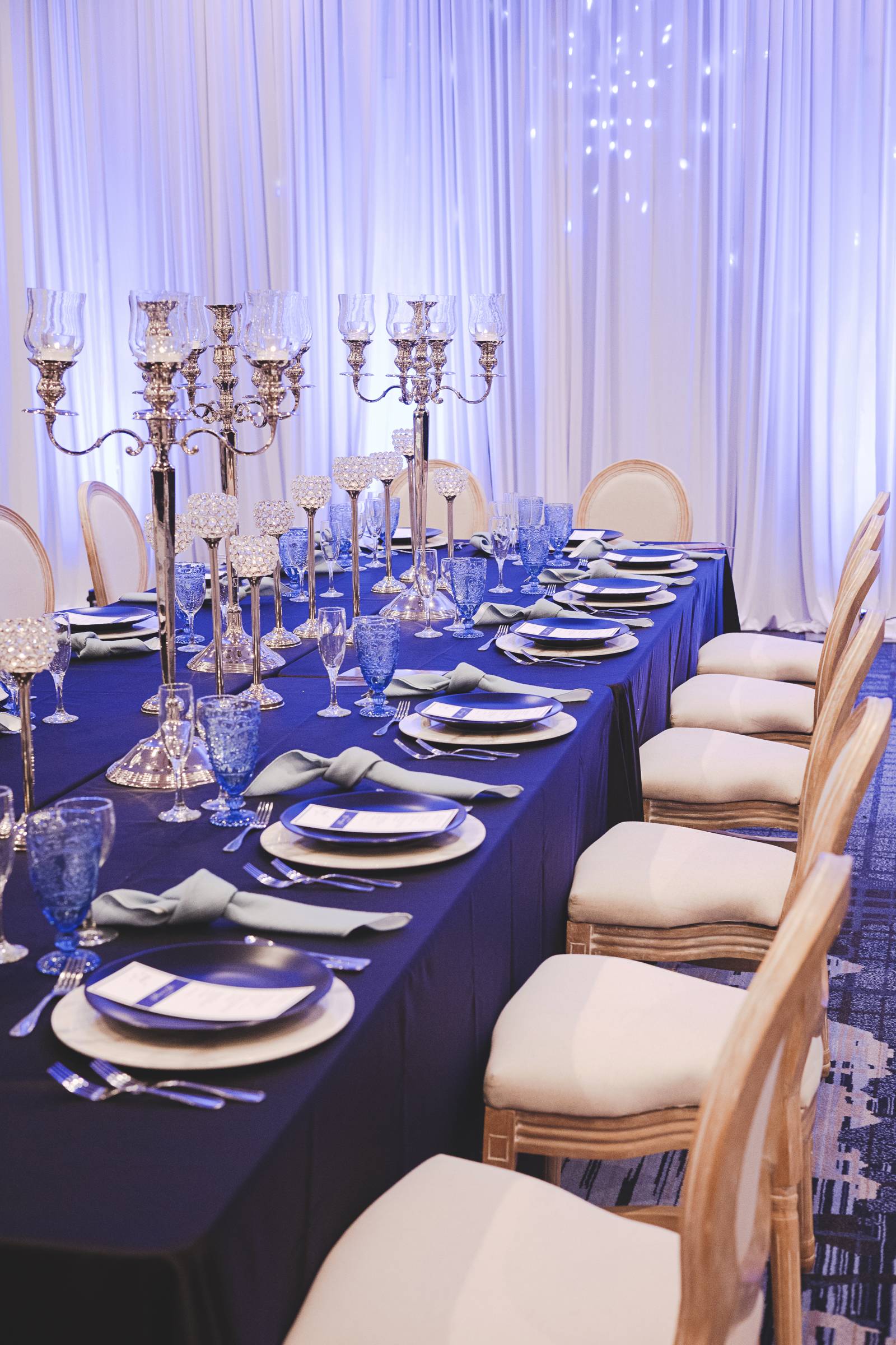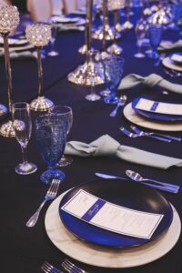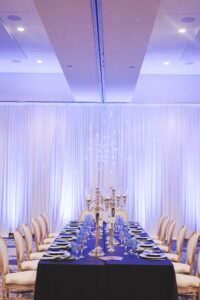 In case you missed it, our 2021 WedPlan Spring Wedding Show at the Madison Marriott West was filled with stunning inspiration from talented local Madison, Wisconsin wedding vendors like what we’re showing you today! Designed and coordinated by HUE by Sarah Davidson, featuring Event Essentials, Celebrations Entertainment, and LK Bridal Studio, enjoy the details from this ornate and elegant deep blue-styled wedding scape below!