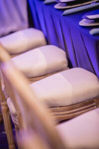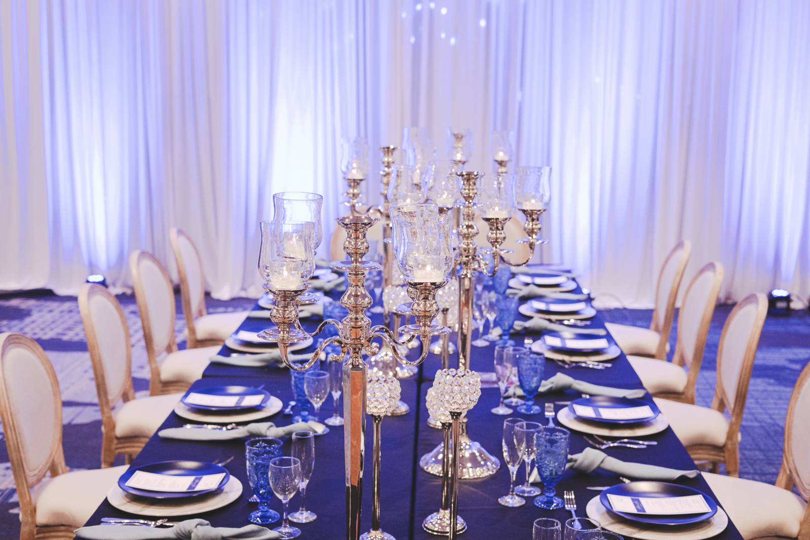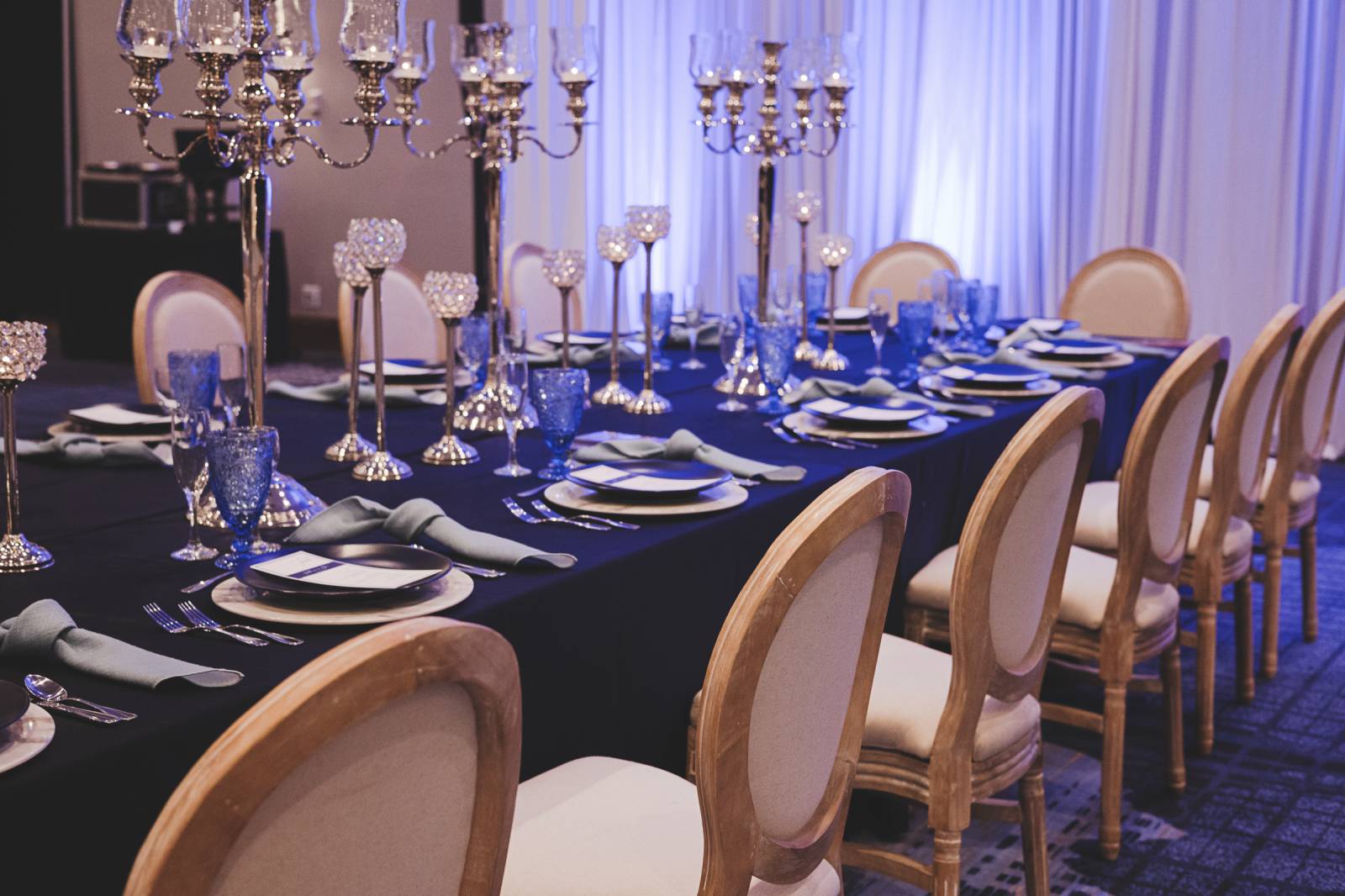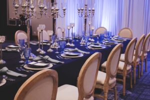 Event Essentials’ ornate candelabras are a statement centerpiece that elevates the polished look to this tablescape. We love the way the light hits these beautiful pieces and sparkles throughout the scene!