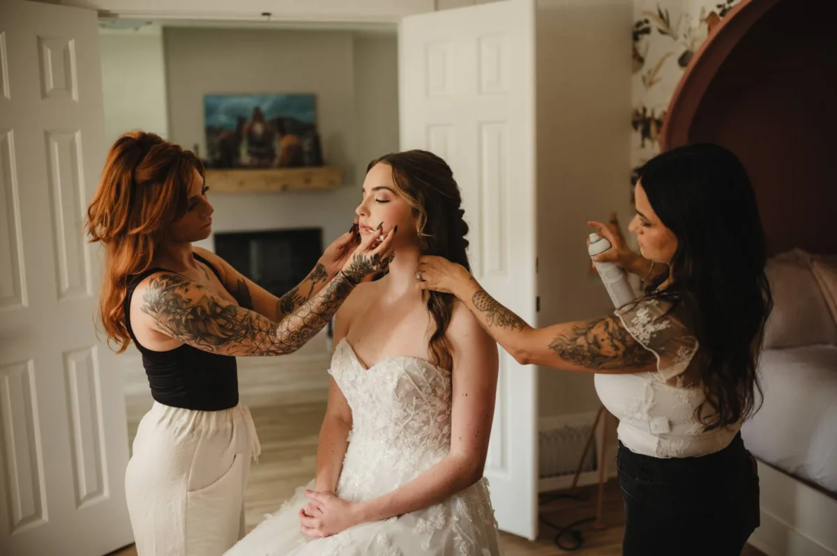The bride wore a strapless, floral embroidered gown from Brides N’ Belles. The A-line dress featured a sweetheart neckline, structured bodice, and ethereal tulle skirt dripping with elegant stitching. Platinum Bond Salon styled the bride with a braided half-updo hairstyle, both intricate and beautifully carefree. The bride’s makeup by TrueToYou MakeUp Artistry was soft and glowing, with a touch of drama on a shadowed lid, rosy blush, and warm pink lip.