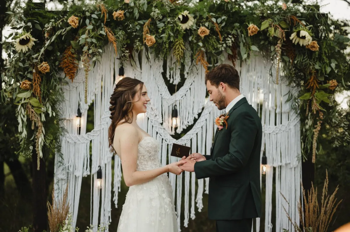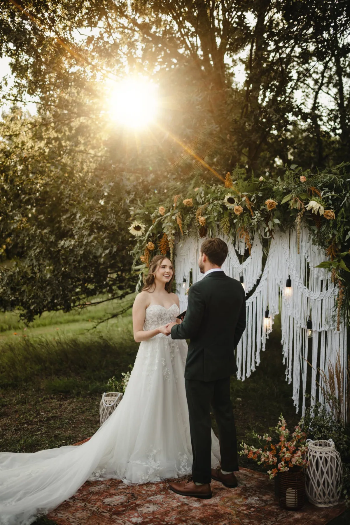Florals and natural textures continued to shine at the ceremony scene, where the couple was framed by a macrame backdrop with string lights, cylindrical woven candle holders, and fresh, wildflower-inspired arrangements.