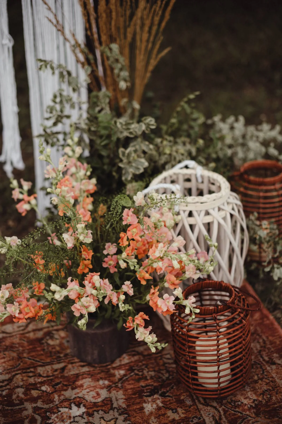 In addition to Signature Events, Social Affair Rentals and D&S Party Tent Rentals helped bring the vision to life with décor and furniture rental pieces, respectively. The lounge was a rustic boho vision, full of warmth and textures, from a patterned rug to velvet and leather seating. Lanterns hung from tree branches above and sat beside the furniture, along with more woven candle holders, bottles, and florals.