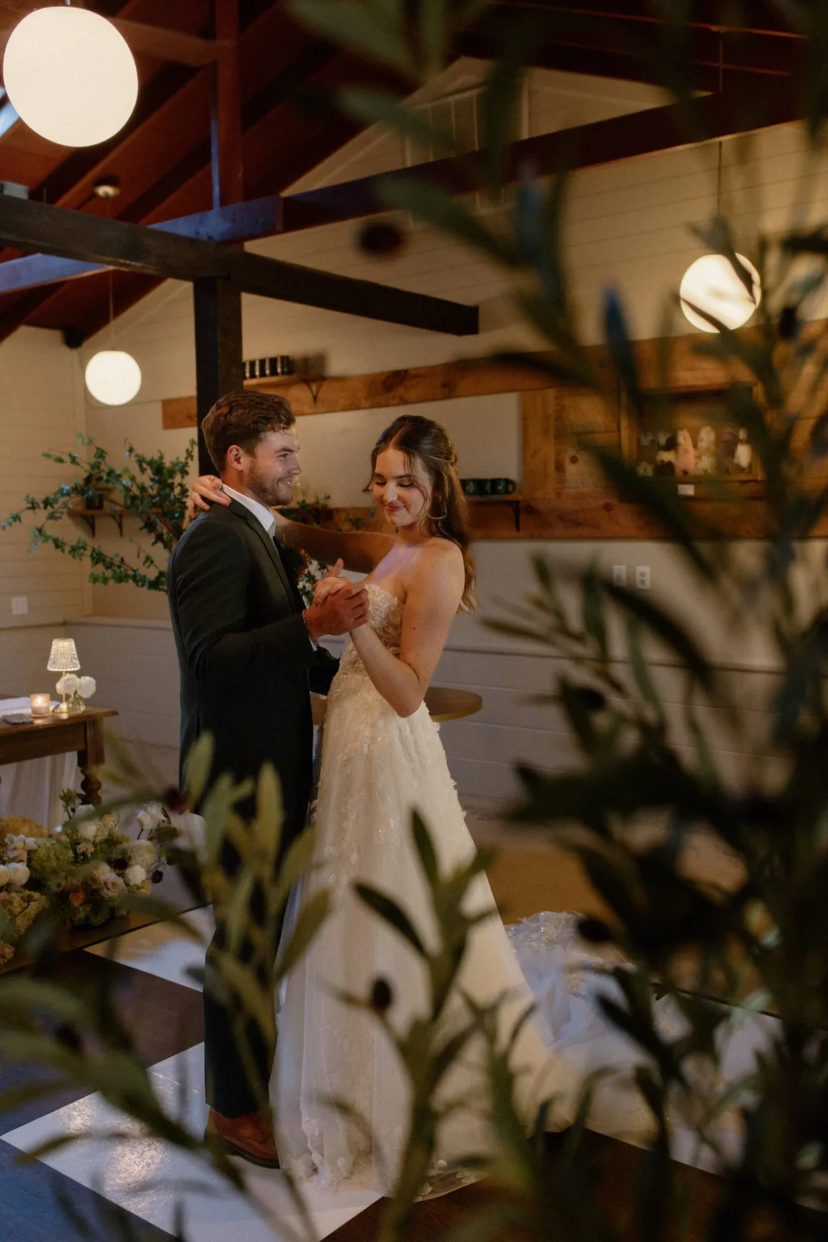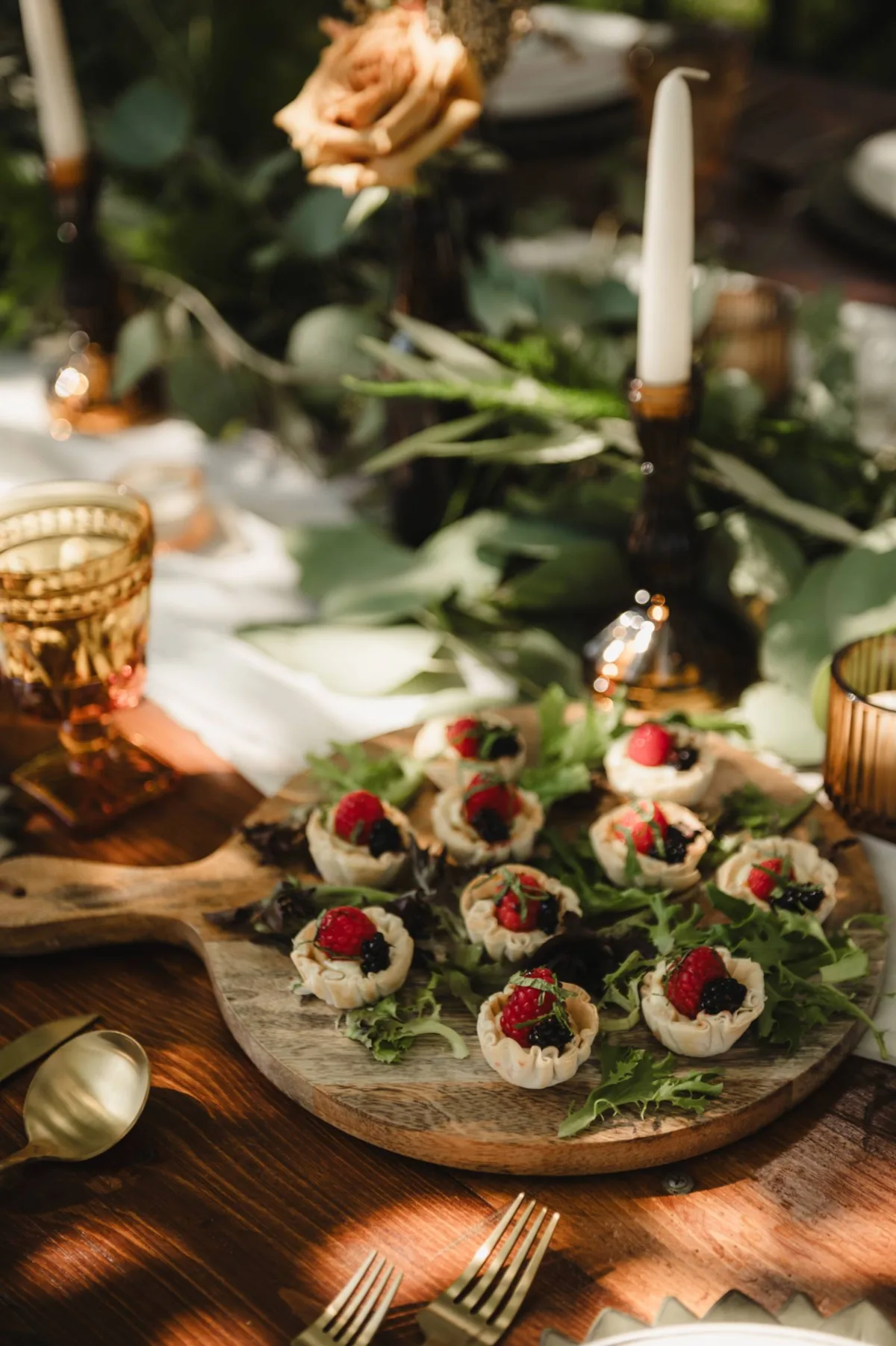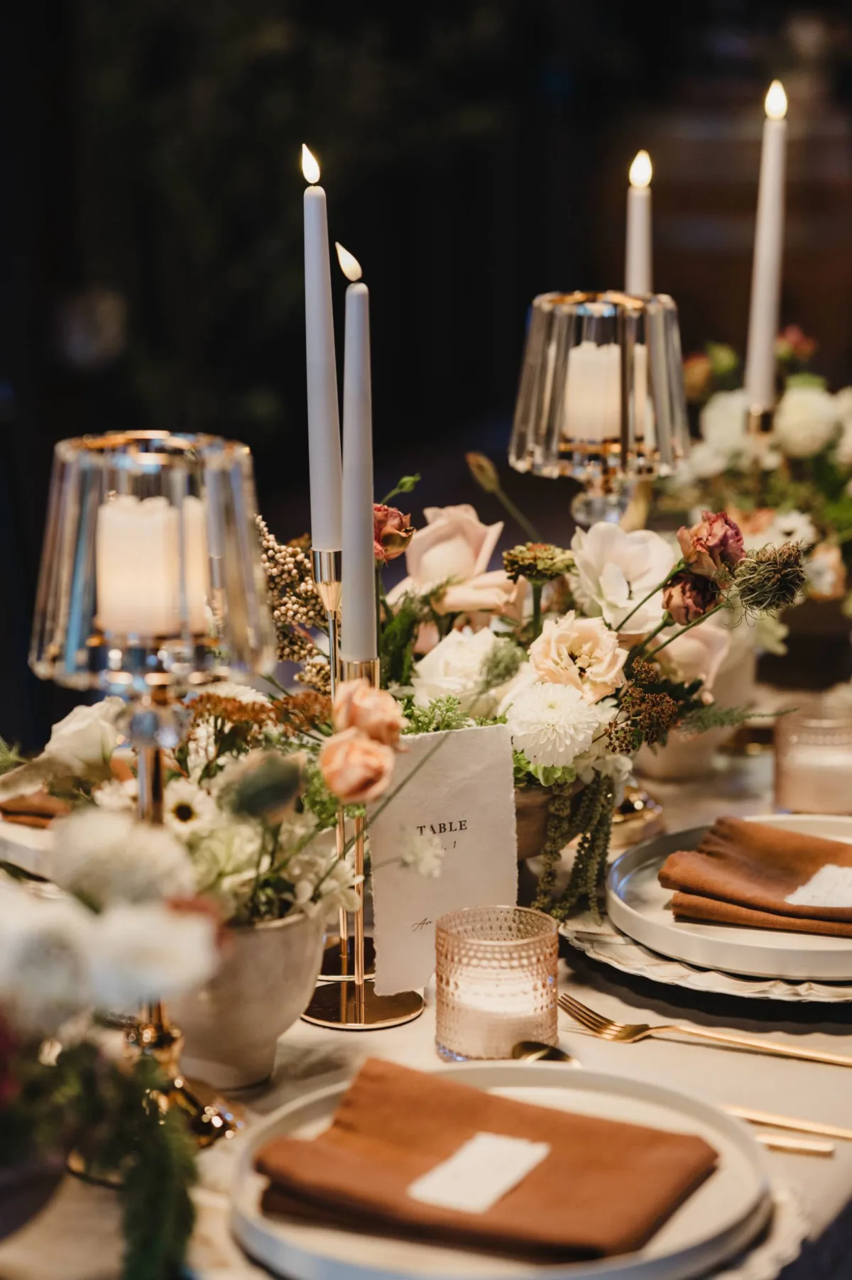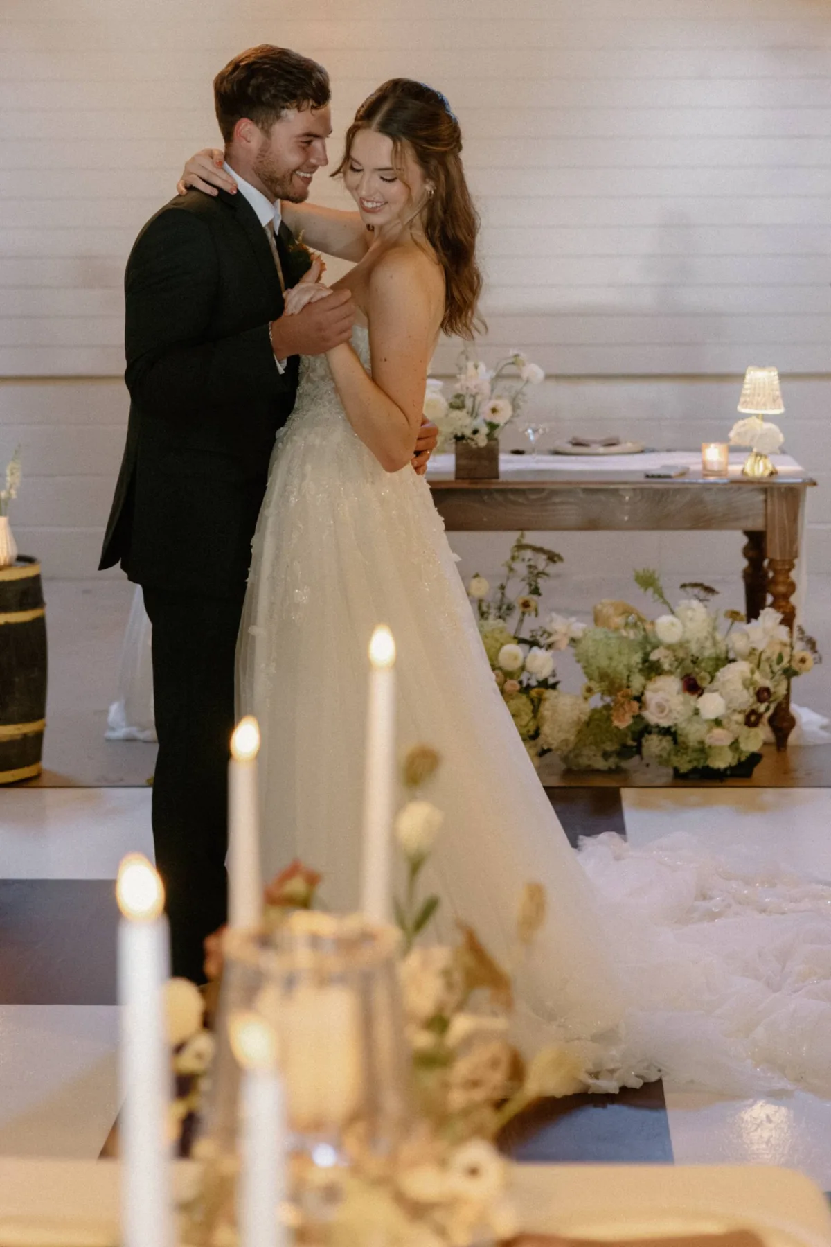 The styled shoot concluded inside, with romantic candlelit lighting and a second tablescape featuring white plates on silver, scalloped chargers, brown linens, tea candles, lanterns, and floral vases. Other special elements included a champagne tower, charcuterie from Tricky Foods, and a second bridal look: a knee-length figure-hugging gown with a twisted neckline and off-the-shoulder sleeves.