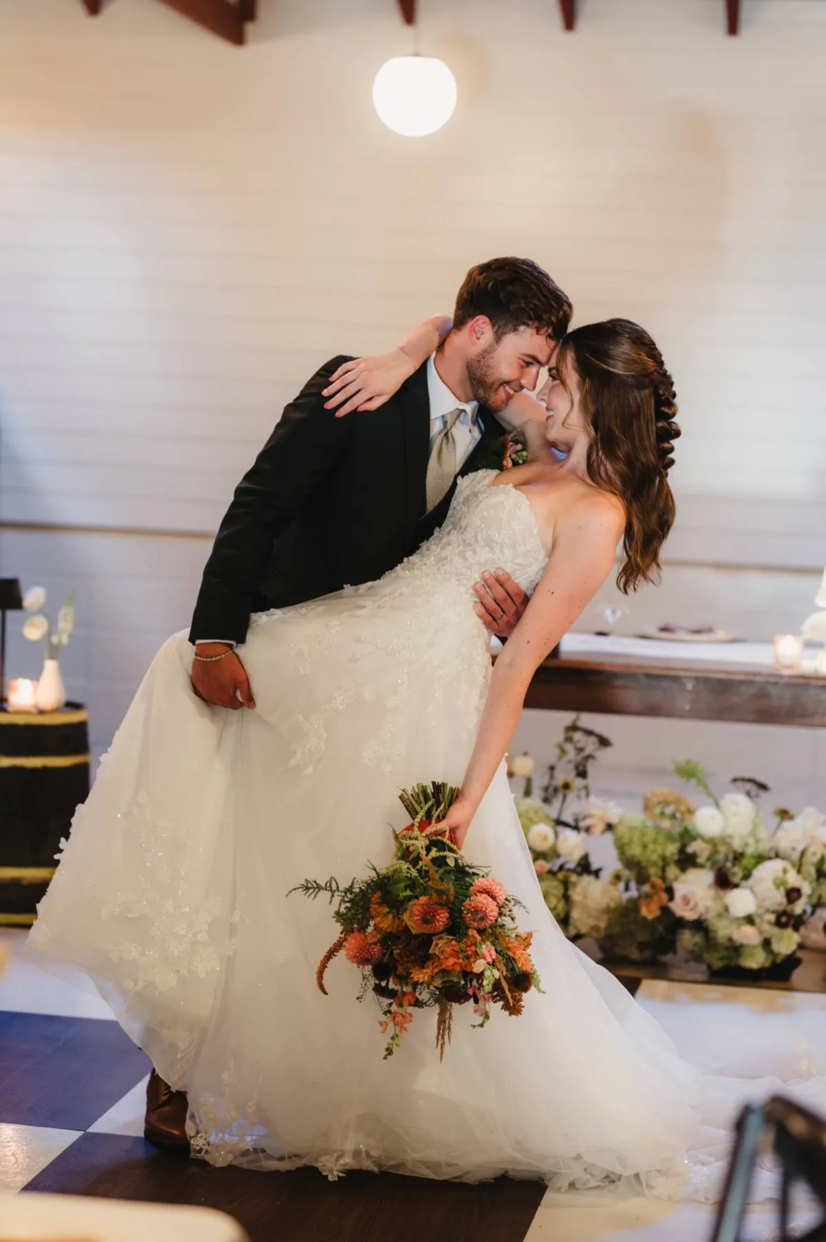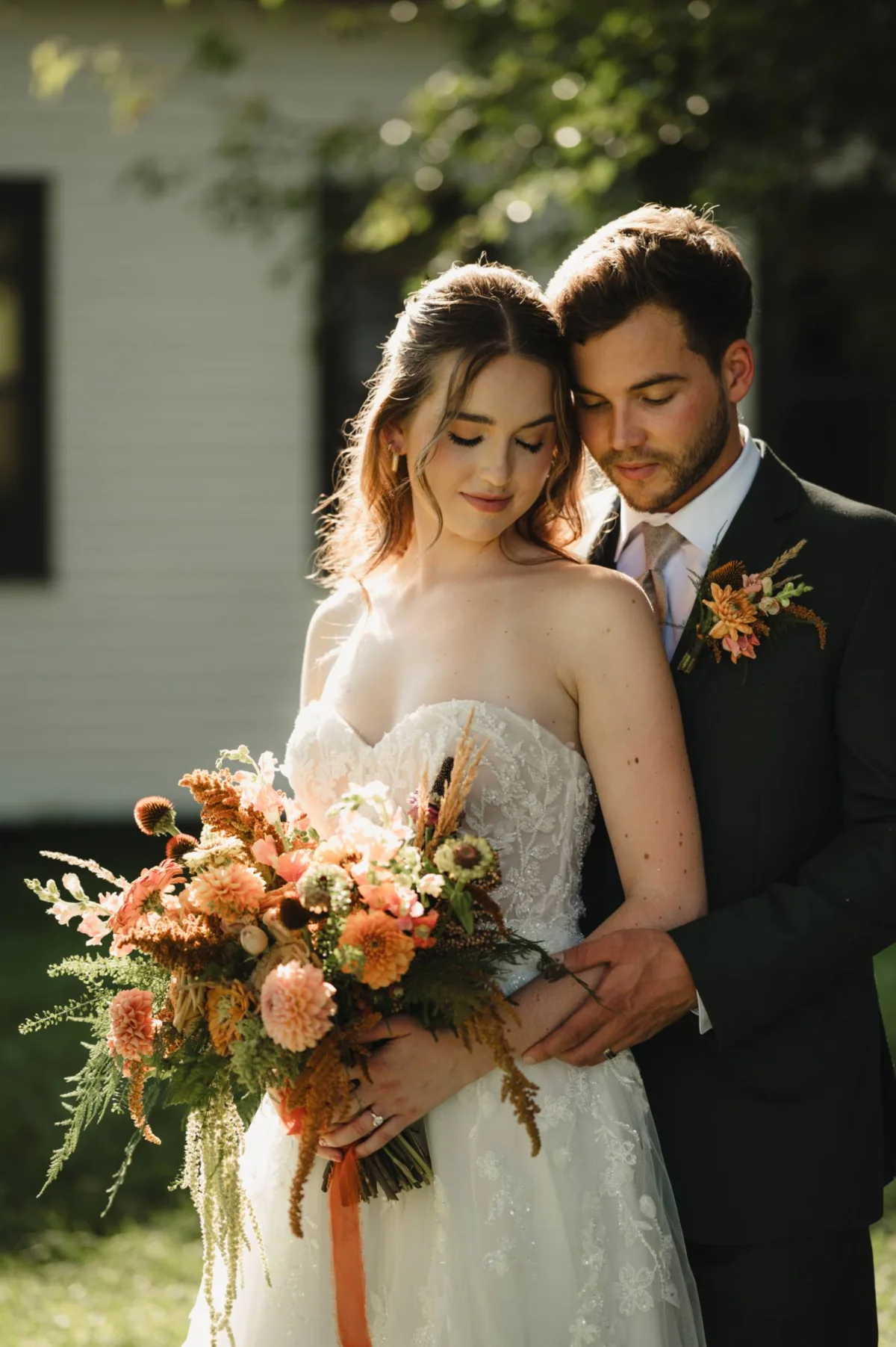 Signature Events provided florals, décor, and design for the styled shoot. The bridal bouquet was a gorgeous harmony of blushes, champagne, toffee, peach, rust, and orange blooms, surrounded by soft ferns and textured foliage. Prominent flowers included dahlias, garden roses, zinnias, chrysanthemums, amaranthus, snapdragons, and coneflower seed heads. A red-orange ribbon completed the free-form arrangement.