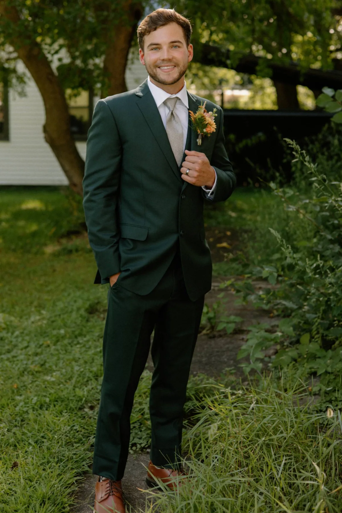 The groom wore a rich forest-green suit, a crisp white undershirt, a patterned sage tie, a floral boutonniere, and brown dress shoes.