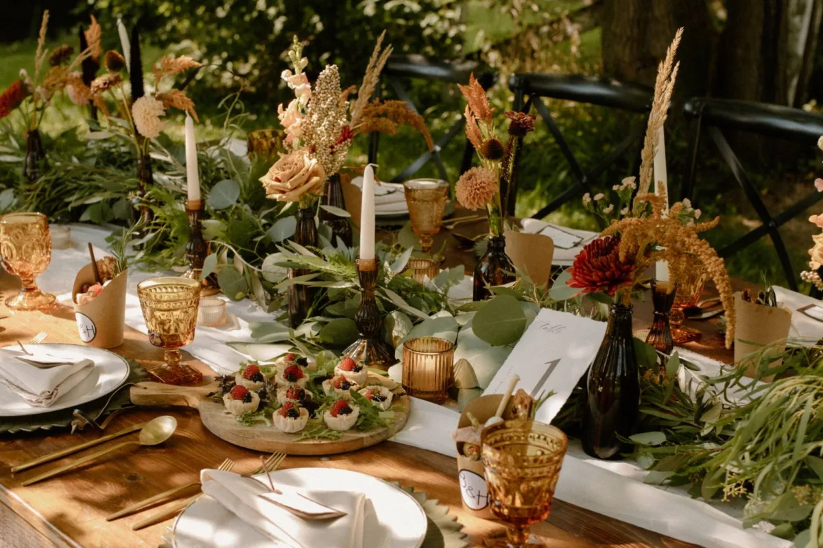 The first of two tablescapes sat under shady branches. Set upon a wide wooden table, pieces included white plates, scalloped green chargers, crystal glassware, natural linens, gold silverware, candles, bud vases, and a cascading greenery runner set upon a white linen.