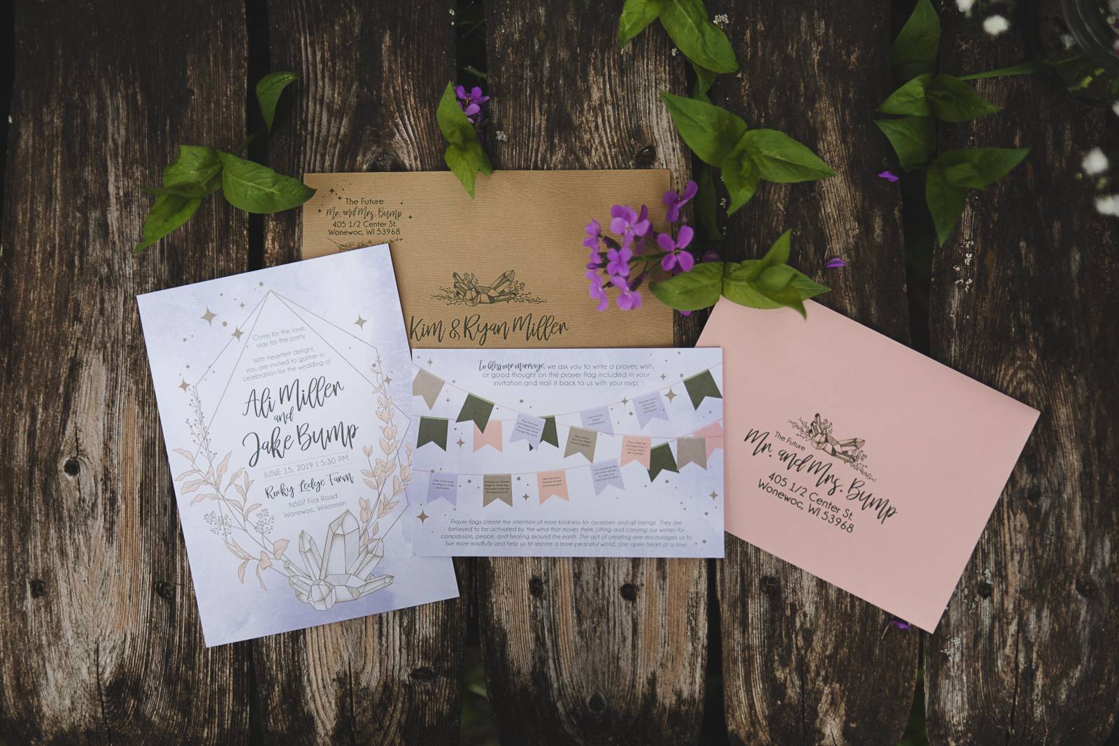 Ali and Jake’s earthy, boho, family farm wedding was one for the books! This nature-loving couple celebrated their big day surrounded by stunning views, sentimental touches, free-spirited style, and their closest loved ones. With photography, paper goods, and signage by LK Bridal Studio, enjoy each earthy, celestial, and eclectic detail this real Wisconsin wedding brings below!