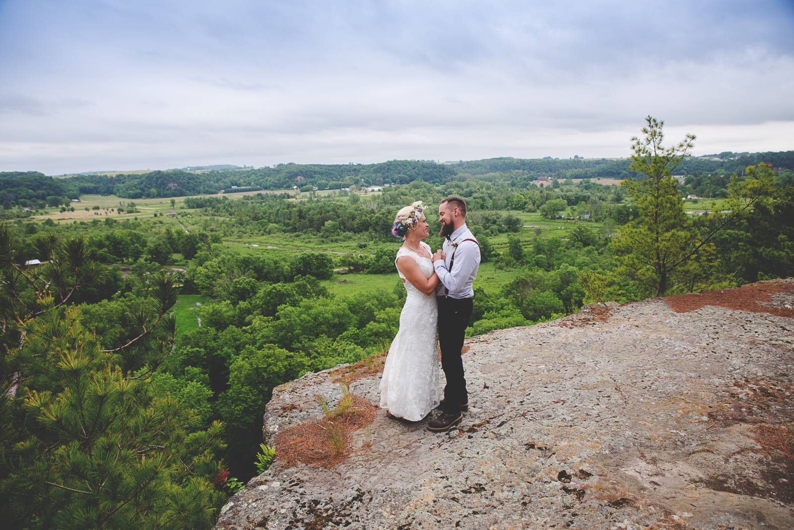 After much persistence, Jake convinced me to go hiking at my uncle’s farm, something that we loved to do but had set aside in the upheaval. My uncle’s farm is near Wonewoc, on the rise of a bluff called Third Castle, along the Baraboo River. As we hiked up the trail, I started at my customary meandering pace, taking photos of nature and the views. Jake, however, was on a mission to get us to the top where the breathtaking views of the bluff were. With much urging, he hustled me up the ridge much quicker than usual. Once I reached the top, I just stood there, taking in the rolling scenery and letting myself de-stress, not paying attention to what Jake was doing. After a few moments, he called out, “Hey Miller, would you just pay attention for a minute?” I turned and found he was down on one knee, ring in hand. It was perfect, and I said YES! Jake slid the ring on my finger and, excitedly, I took the ring immediately off so I could really look at it.