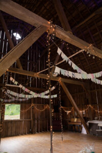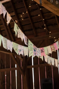 One detail I was very excited about is a special request we mailed out in our invitations. We sent a Prayer Flag (colored cloth), asking guests to write a small pray or well-wish for us. The Prayer Flags were sewn together hung over our reception area int he barn. My thought was that as the wind moves across the flags, they will carry all the prayers out into the universe on the day of our wedding. This way, even the guests who cannot physically join us for our marriage will be present. It also resonates perfectly with the earthy, boho style our wedding had. It’s all about the love!