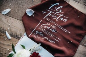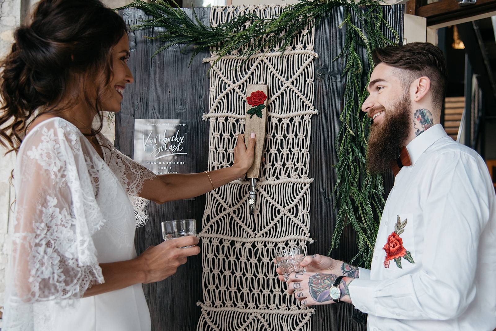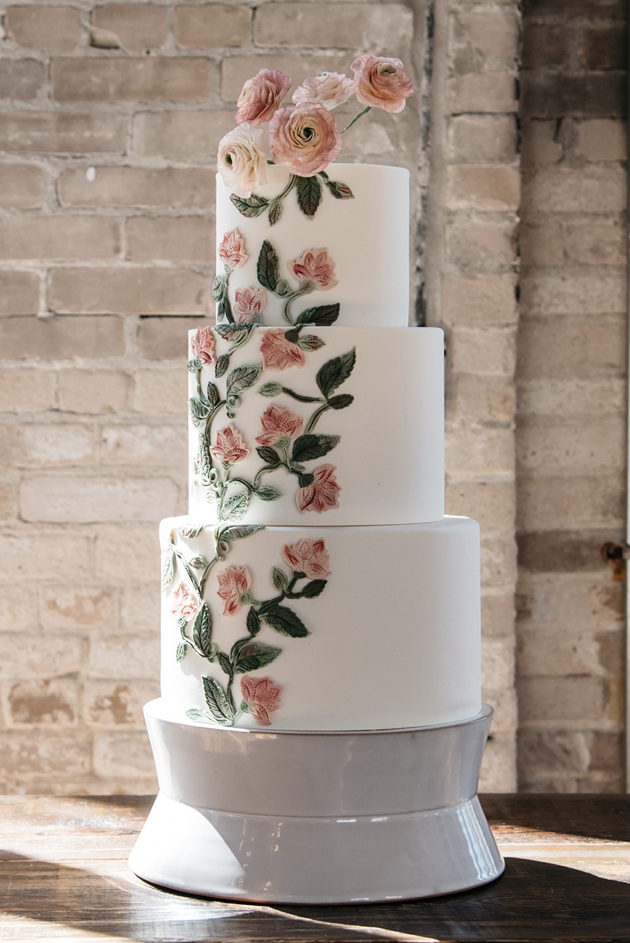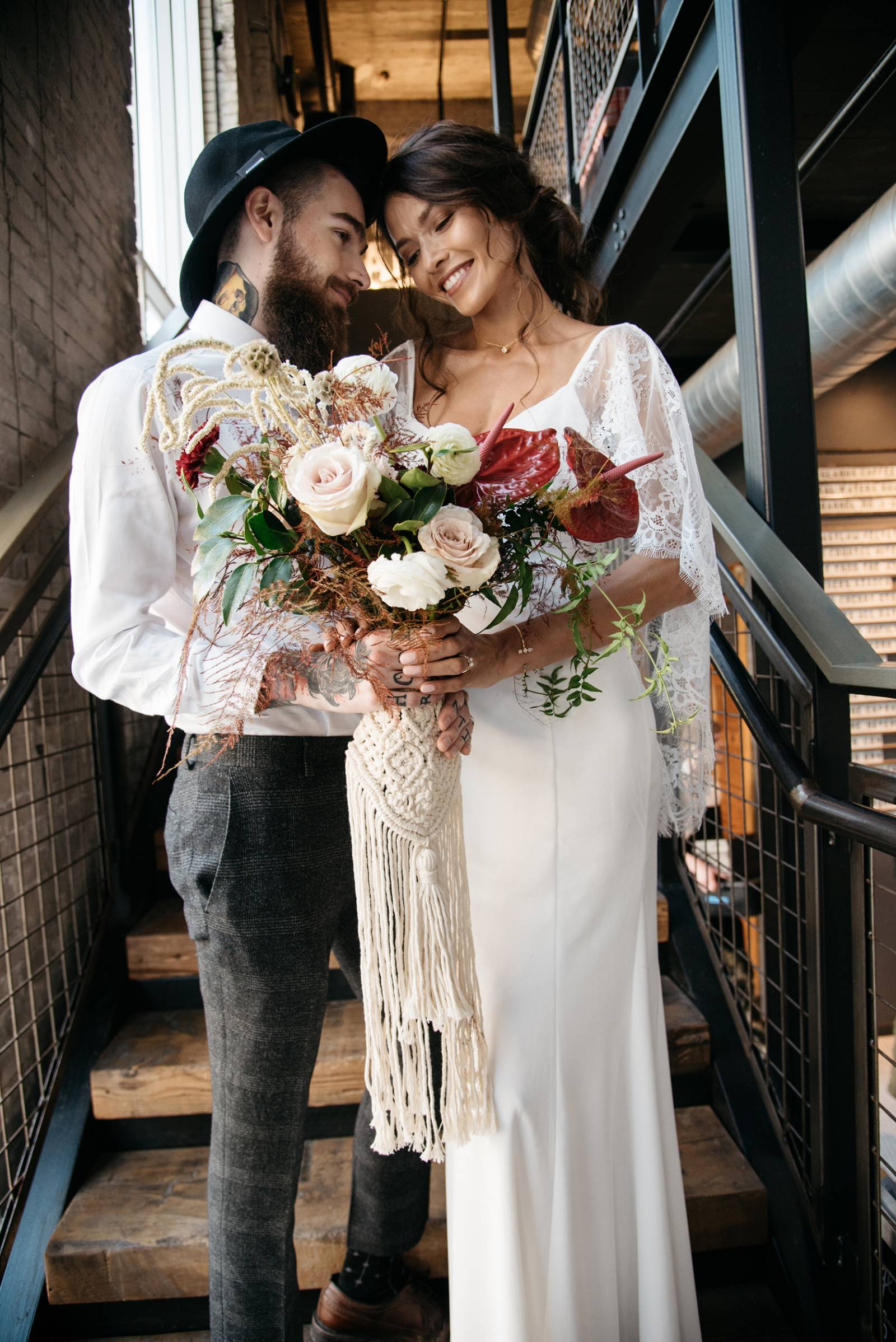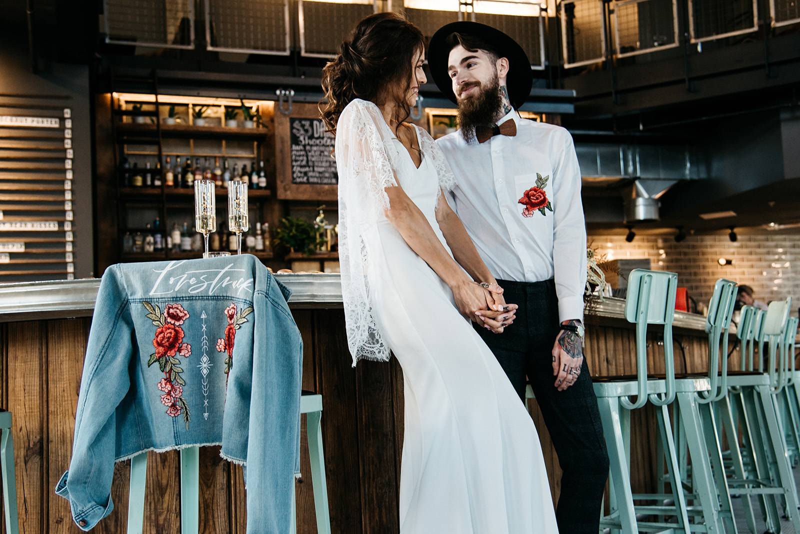 Can we talk about this stunning, jaw-dropping cake designed by Curtis & Cake for a sec? This inspiration shoot from Lampstand Photography is the perfect marriage (pun intended) of organic textures, industrial beauty, and colorful boho aesthetics. Combining the best elements of both styles carried throughout the design — from the floral embroidery, silk calligraphy invitations, leather envelopes to the custom tap beer wall, crafted cocktails and wood fire pizza — this editorial has it all for your Madison wedding inspiration blueprint.
