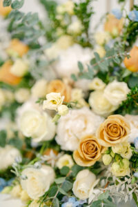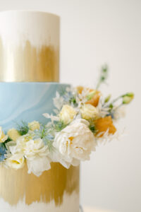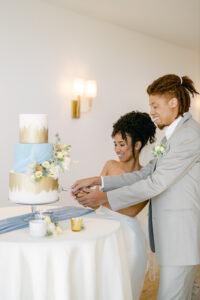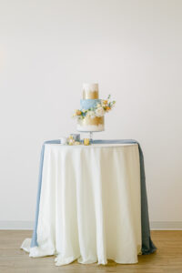 Inspired by the elegant gold chandeliers of The Eloise’s dazzling venue in Mount Horeb, Wisconsin, this contemporary wedding design presents a dreamy blue color palette and effortless trendy details from pearl-enveloped heels and a pocket boutonniere to a sweet, sparkling tower of champagne to cap off the evening. Shimmering gold touches carry through even the smallest detail of delicate rimmed glassware, while lush, joy-filled florals from Melody Rose Designs brighten the celebration with color and whimsy. Captured by Makayla Mashlan Photography, find inspiration for your own best day ever below!