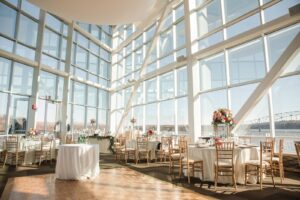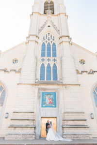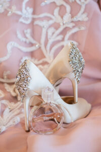 This couple’s contemporary, elegant wedding design proved the perfect celebration along the Mississippi River, that all began with the most beautiful wedding gown with crystal embellishments and an open back from Vera’s House of Bridals. With greens and romantic garden bloom bouquets, all crafted by Hy-Vee with a dreamy color palette of blush, pink, gold, and a pops of blue. Paired with the most decadent dessert station we’ve ever seen, with eclairs, french macarons, mini parfaits, cake pops and chocolate covered strawberries made by the bride’s sister. Take a peek at the stunning imagery by Mindy Leigh Photography that’s putting a modern twist on your traditional wedding.