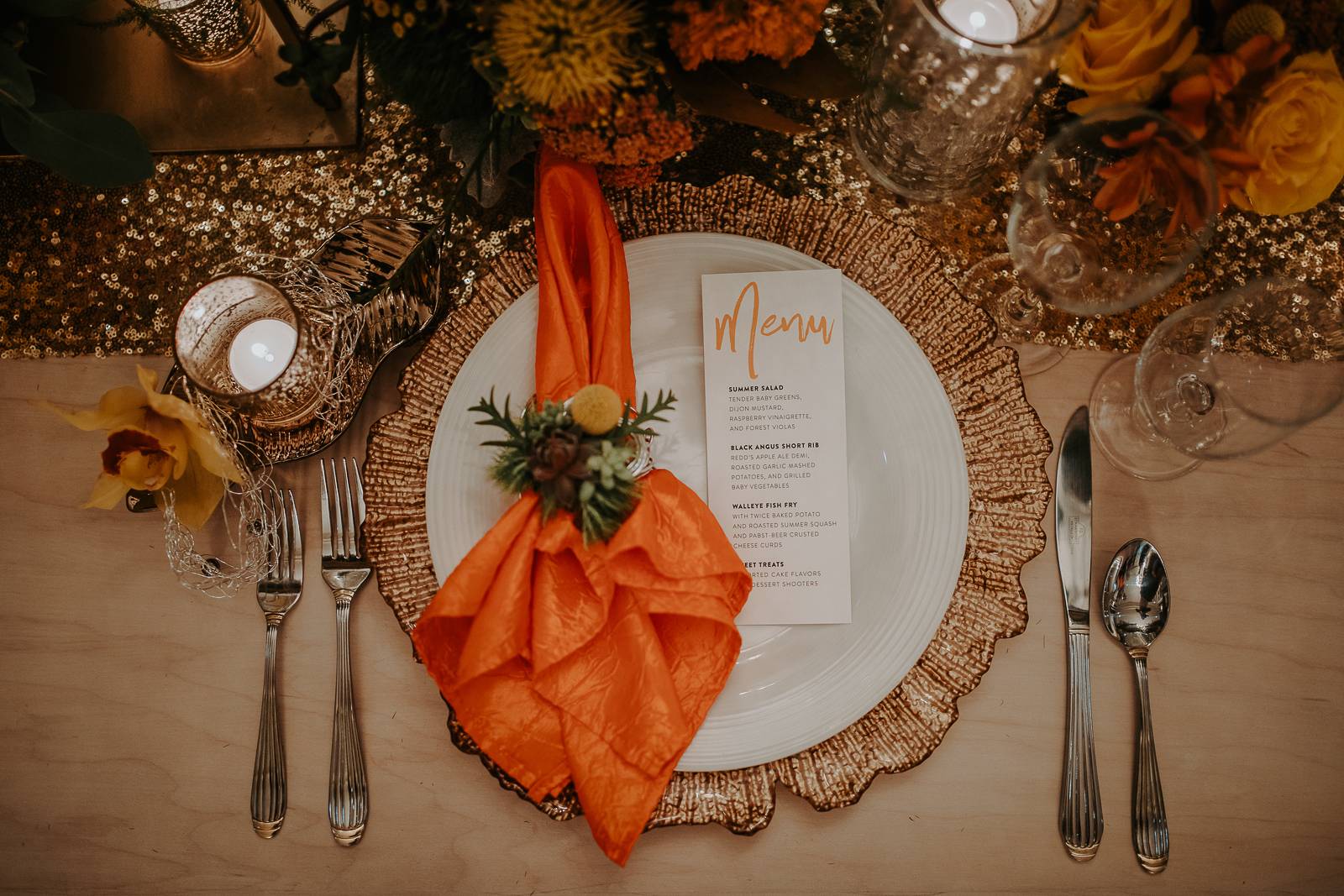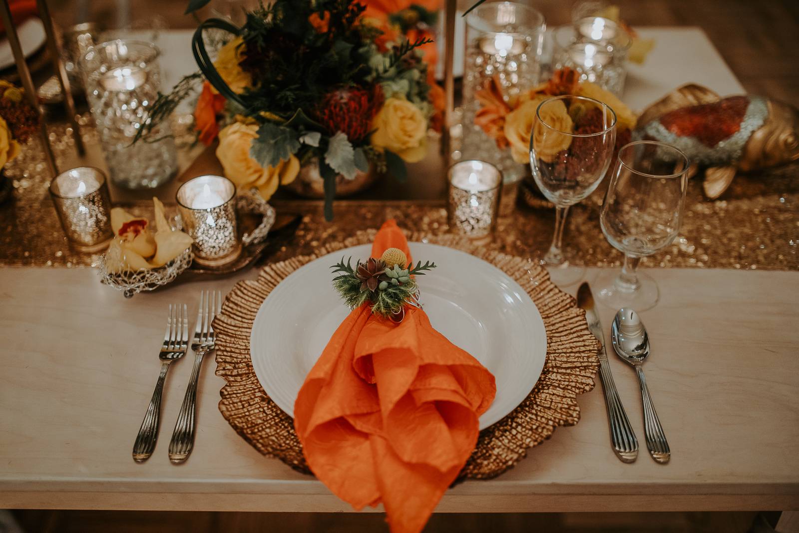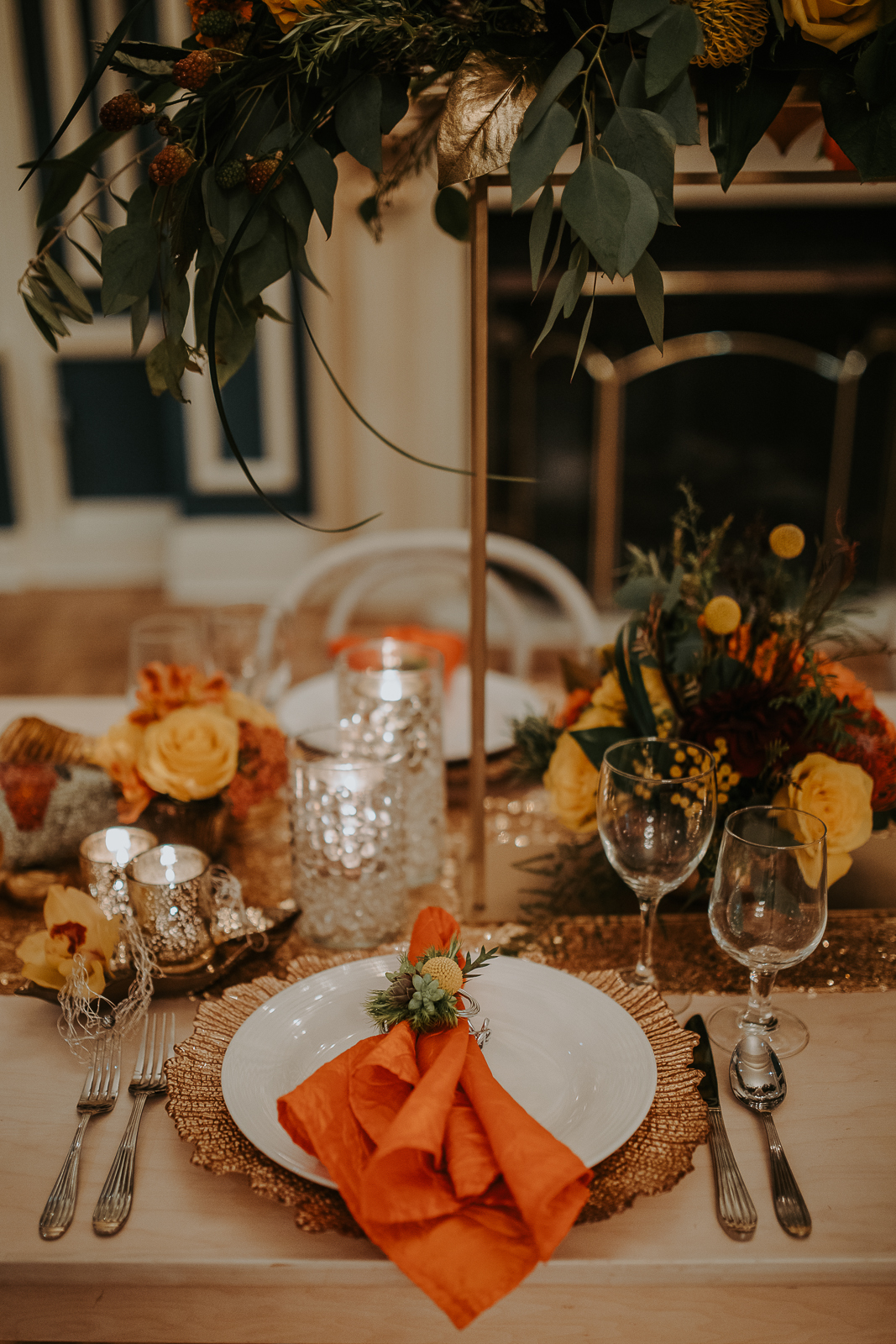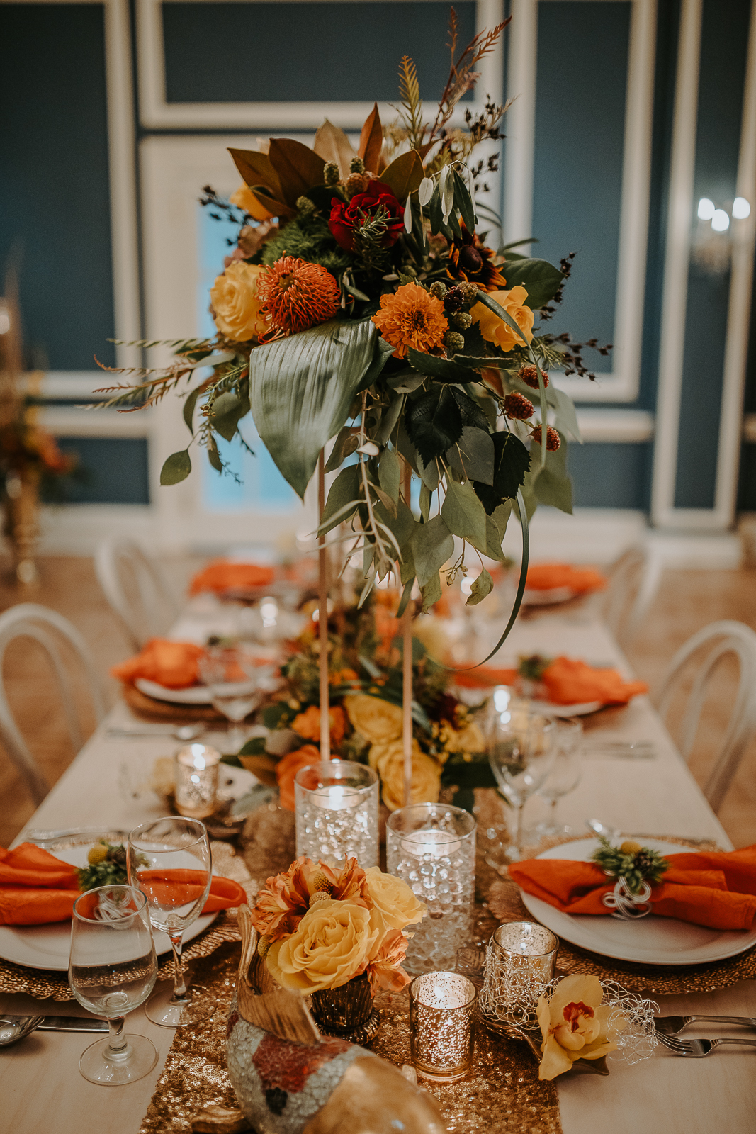 The star of the show in today’s styled wedding scape is truly Surroundings Events & Floral. Their bright, bold, and textured floral arrangments create stunning focal points across today’s design. Adding height, warmth, and elegance, we love how intentional each bloom is in creating the vibe of this beautiful wedding scene they created.