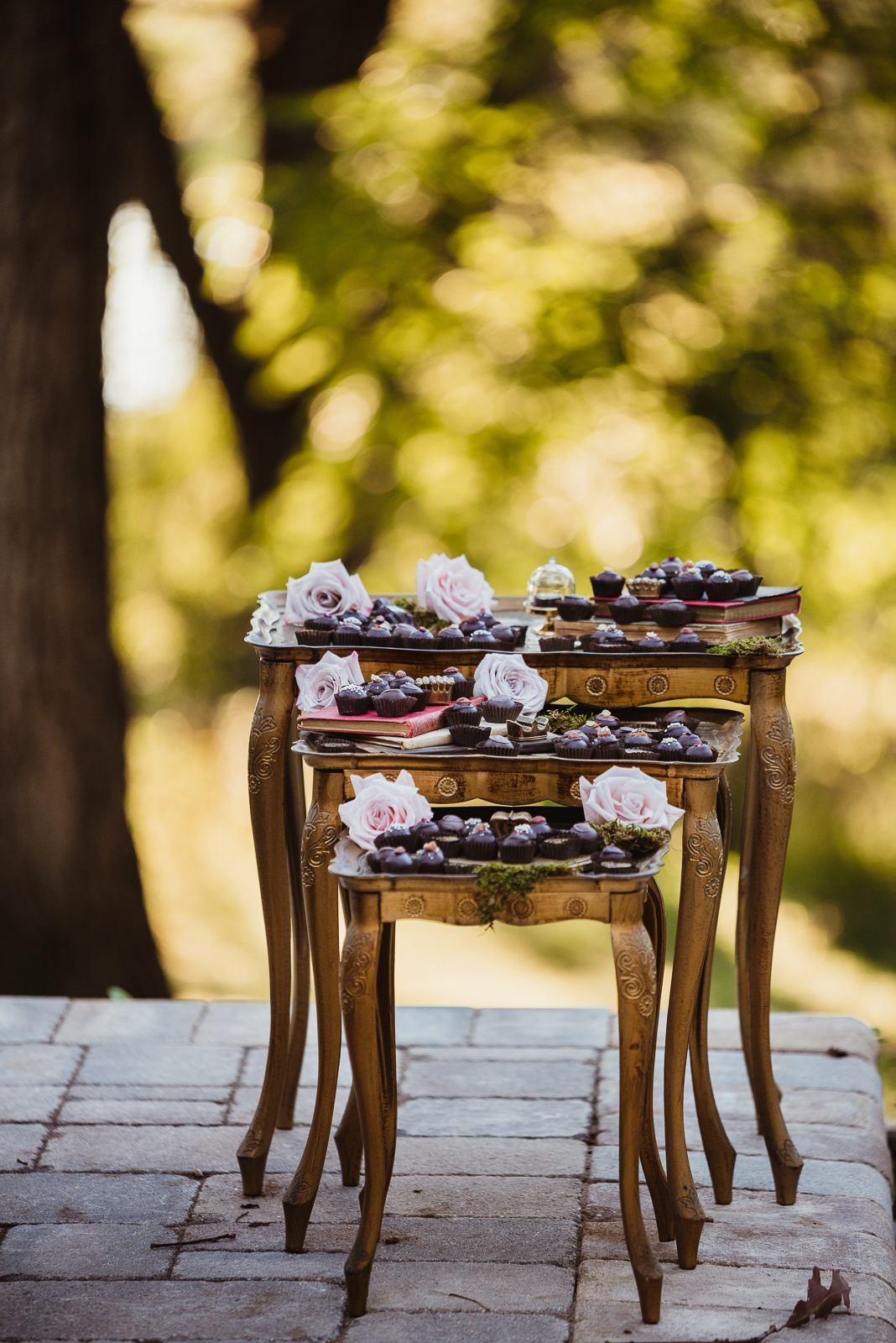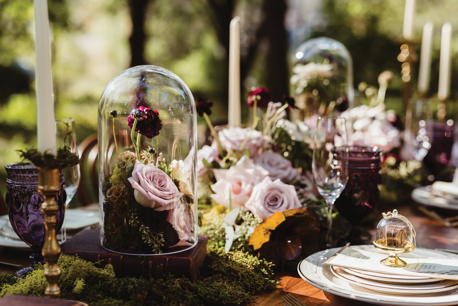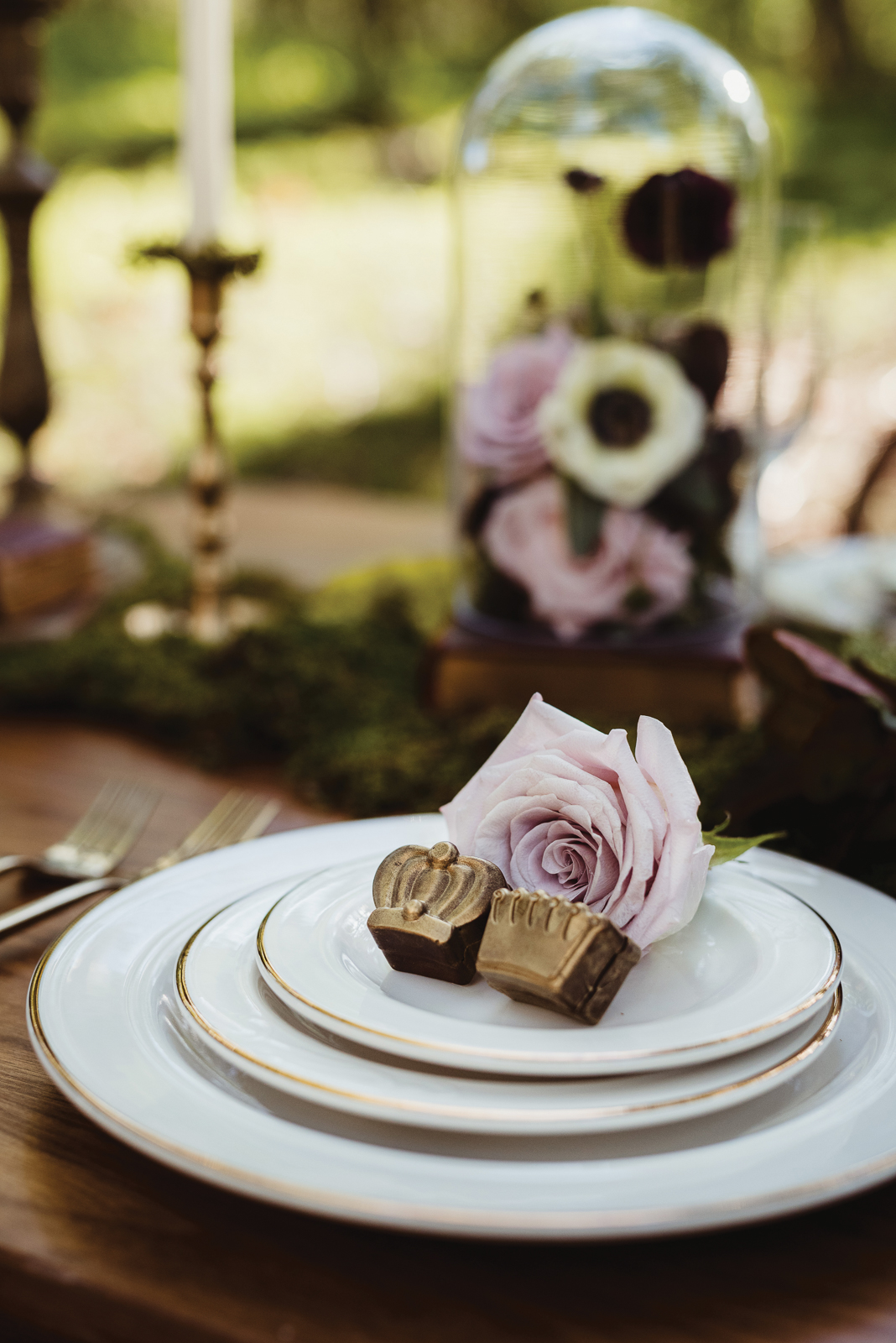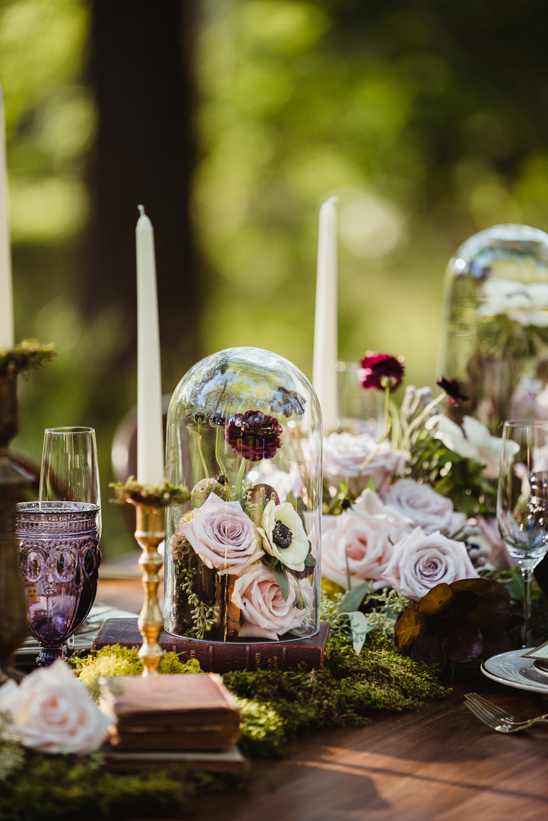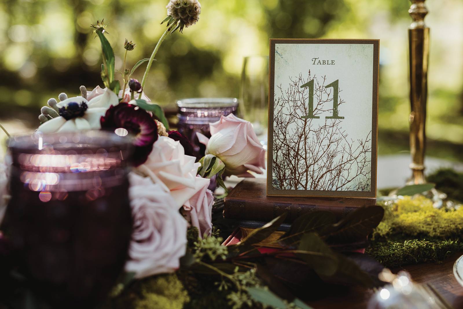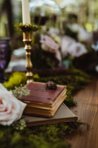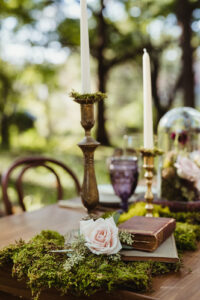 Filled with magic, elegance, and whimsy, B-Style Floral‘s arrangements of beautiful blooms are a focal point in this charming display. The touches of moss create earthy texture, while delicate roses bring a spellbinding romance.