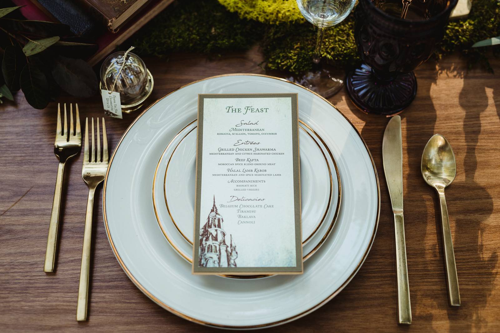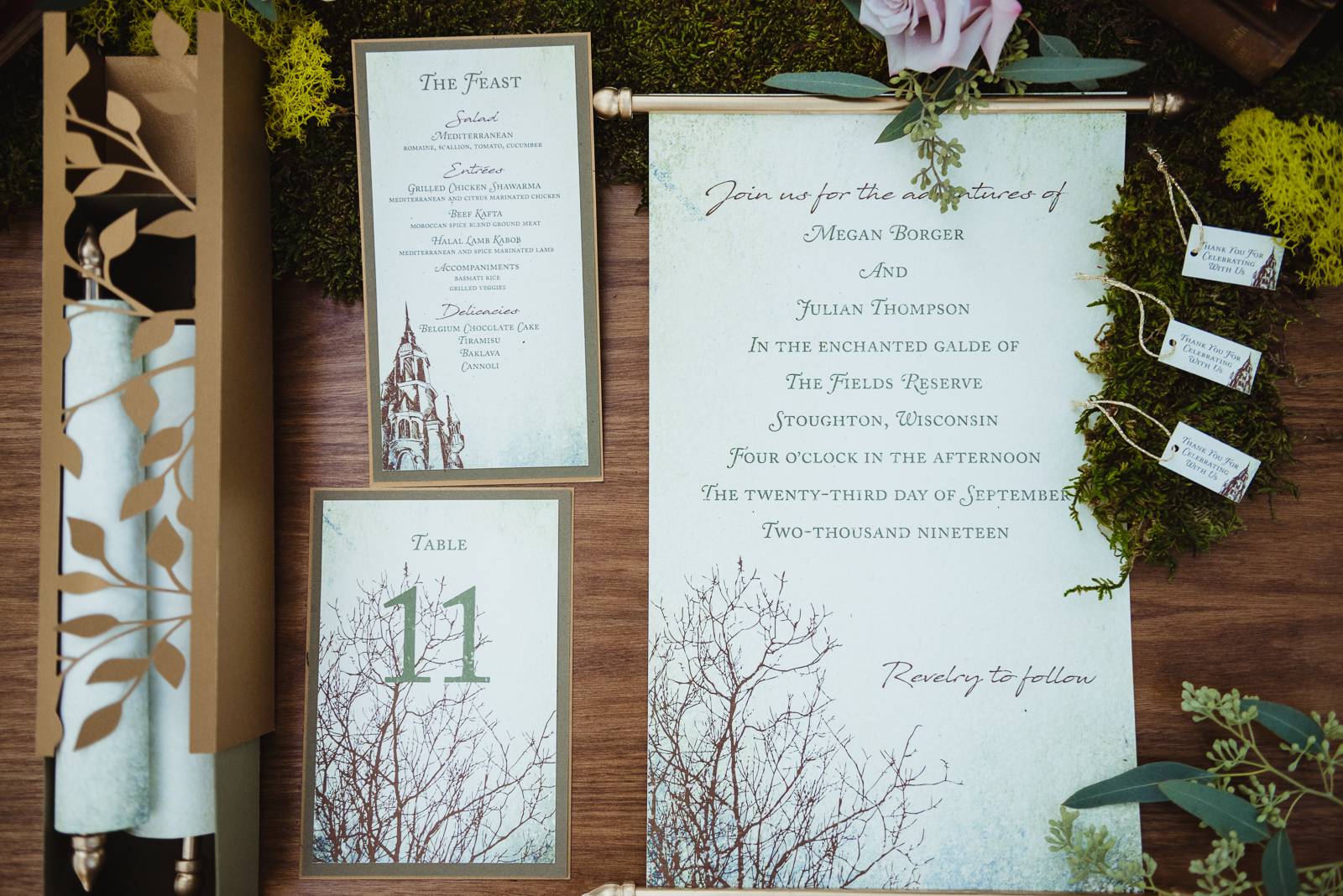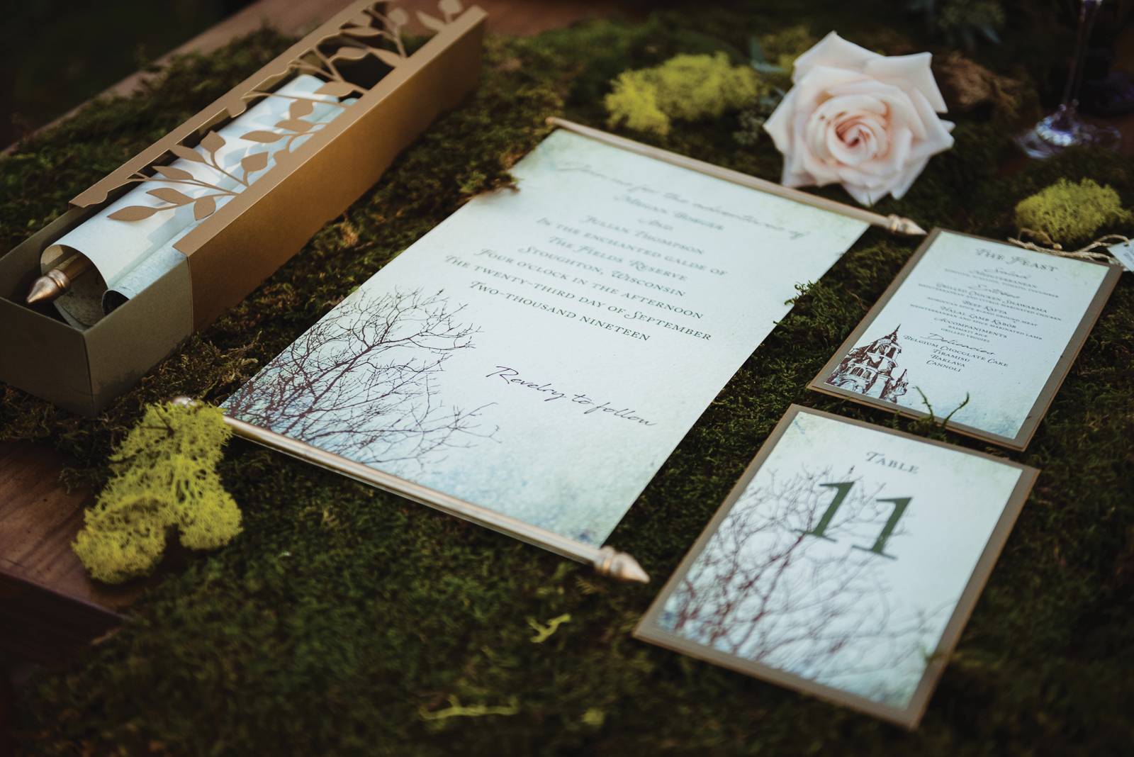 Sugar Pear Design brought historic charm and romance in their delicately designed paper goods for this enchanting scape. By scroll is the only proper invitation to an affair quite as magical as this.