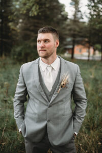 Groom: Lukas wore a medium gray slim-fit suit with an ivory button shirt and tie. I wanted him to stand out and look slightly different than the groomsmen.