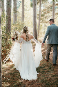 WHAT WERE YOUR WEDDING MUST-HAVES? We fell in love with the enchanting vibe of our venue, Caribou Bay Retreat! The venue’s ceiling is covered in vines and twinkling lights, which made me cry the first time I saw it. I knew at that moment it was our must-have venue! Mona and Jack have such a beautiful property that has been transformed into a fairytale retreat for weddings. It was important to us that we could have the ceremony and reception at the same location, which is something Caribou Bay offers. A bonus is that we had the resort, including a cabin for Lukas, myself, and our wedding party to stay at from Thursday to Sunday. Weddings go SO fast, and I didn’t want to feel rushed. On the day of the wedding, I was getting my hair done in the master suite and looked out the window to see Lukas and his dad fishing on the property’s pond – it was little moments like this that brought me so much joy.