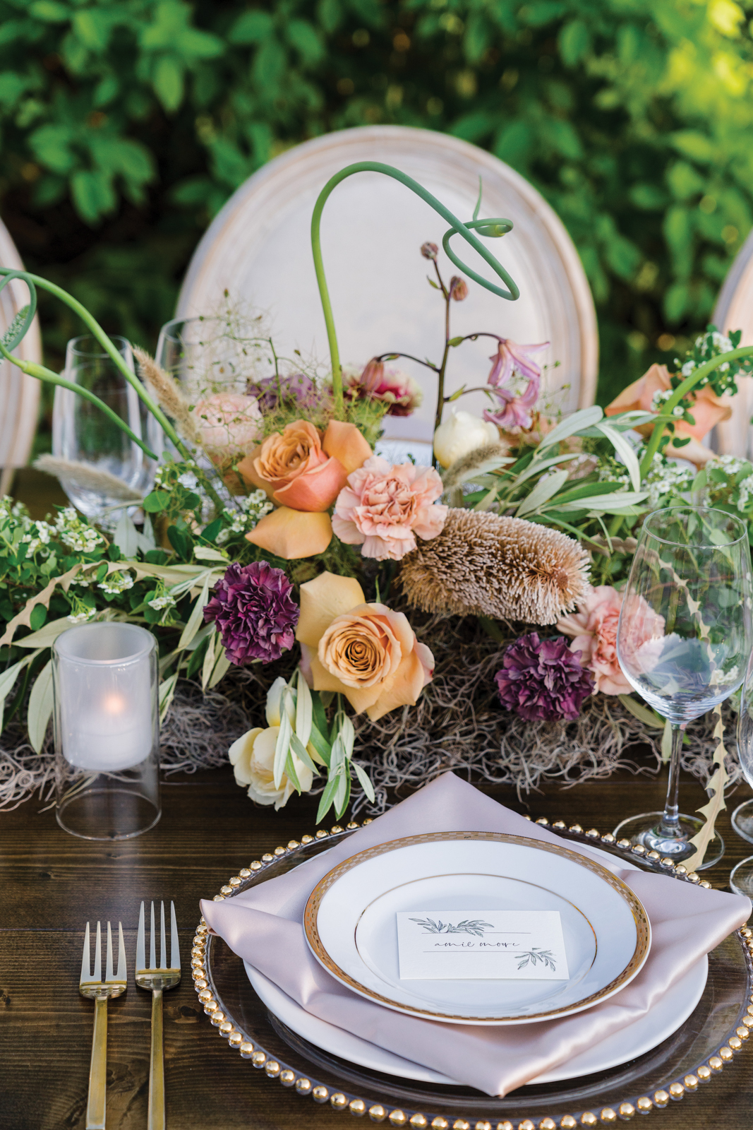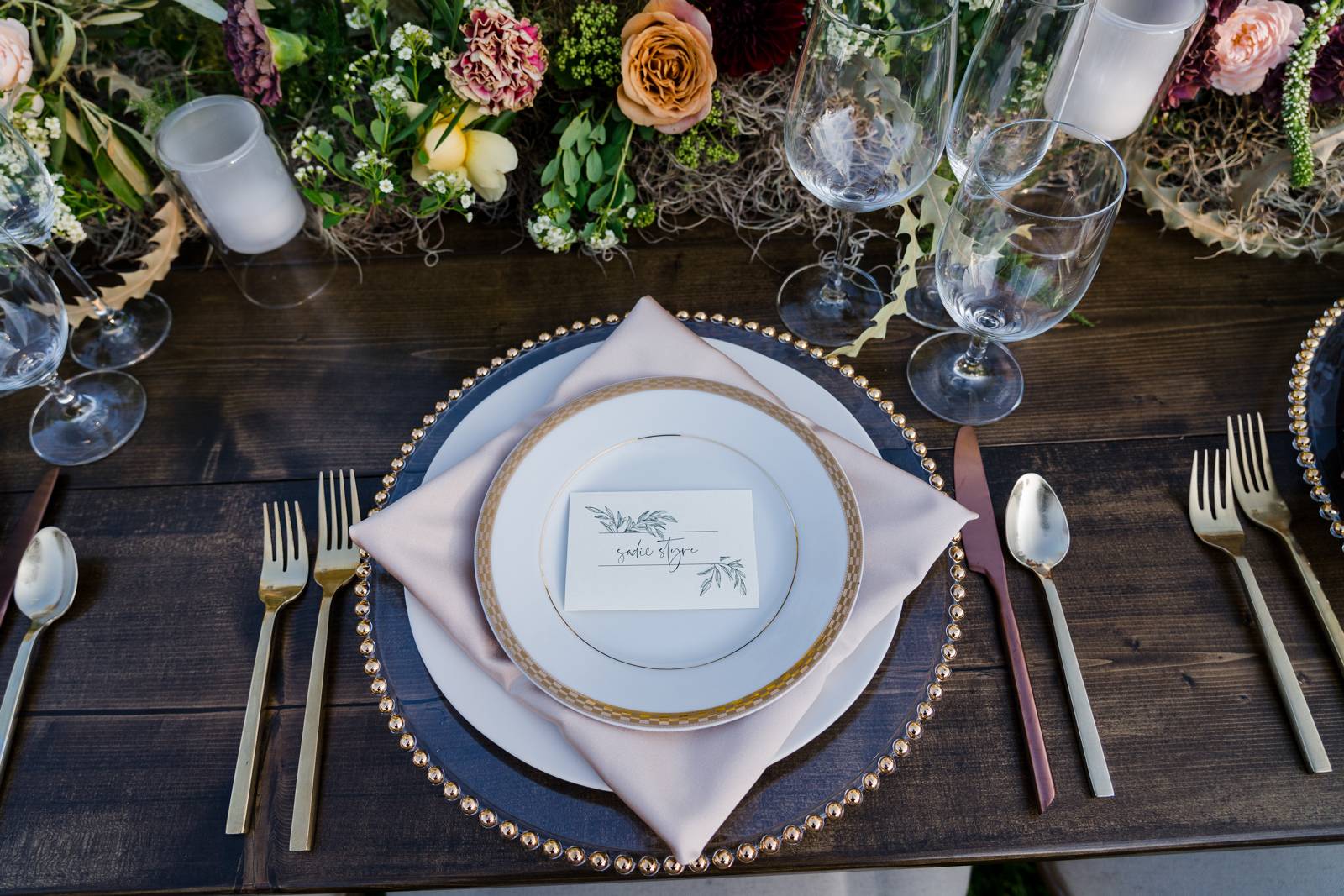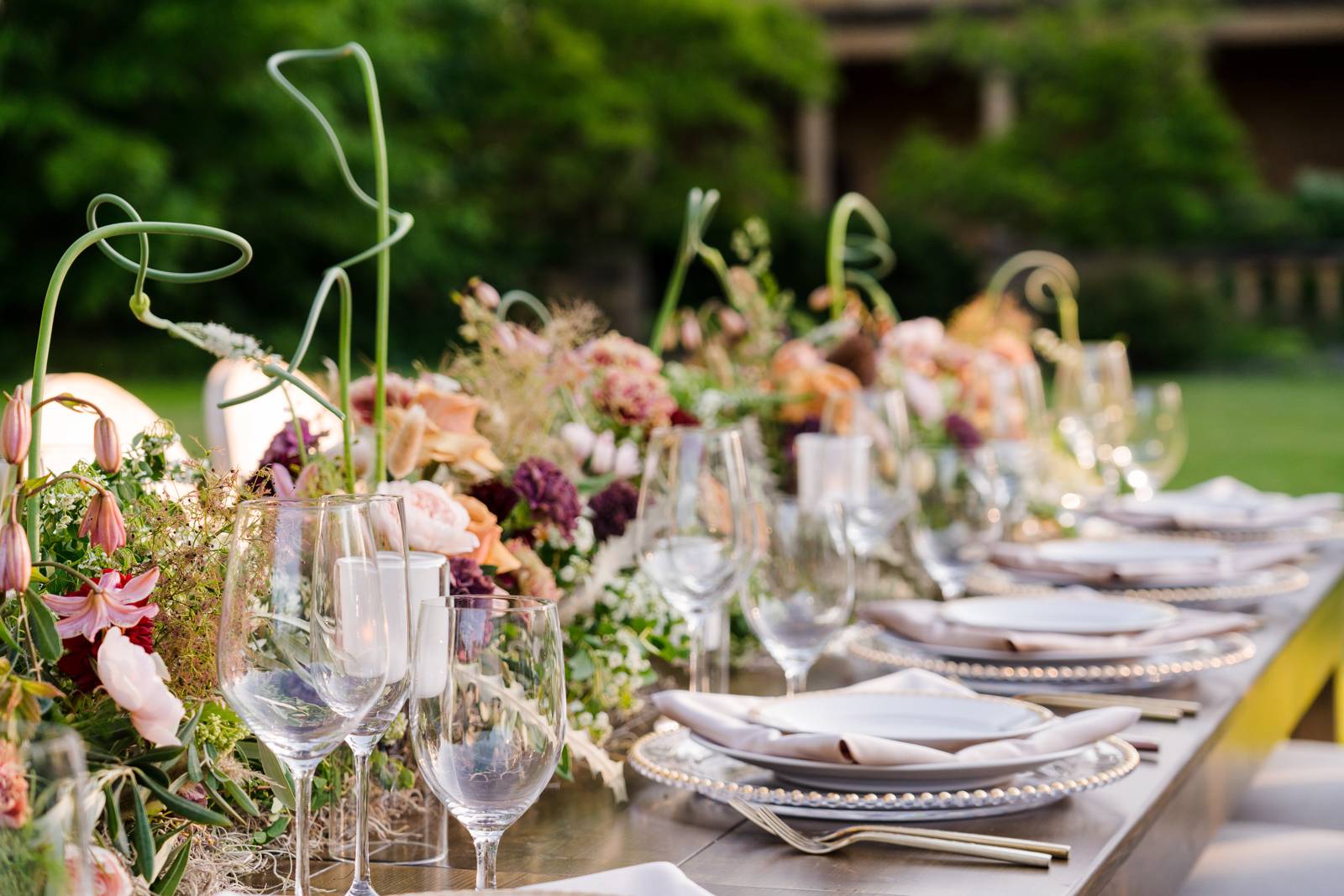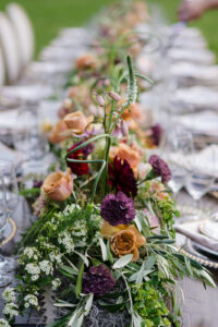 Gorgeous rental pieces from Event Essentials, such as this long wooden table, add eye-catching, statement elements to your big day.