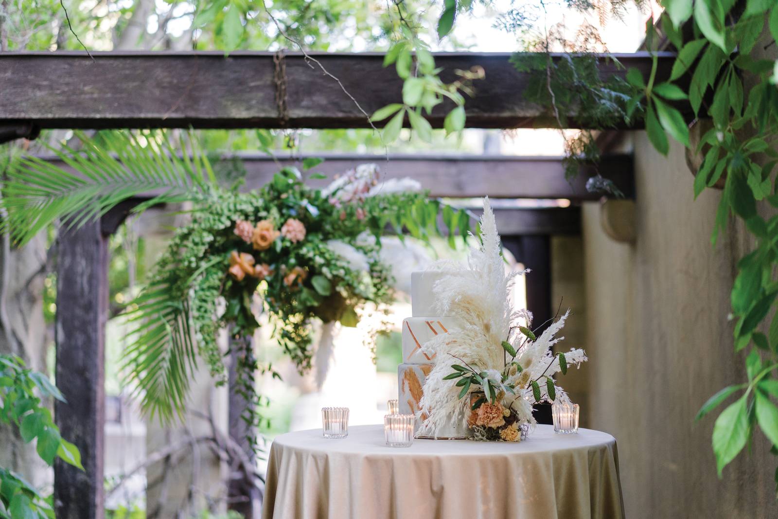 A stunning cake from Creative Confections by Alicia Russell adds a modern flair to this garden wedding oasis.