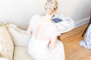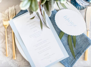 Bring on the blues! From the various hues for the floral, ribbon to the tablescape and cake, this wedding inspiration is brimming with beautiful blues and we’re downright smitten. Be Inspired Salon styled the bride’s hair and makeup and can we just talk about that beautiful braided updo? Be Inspired Salon is an upscale hair salon boutique located in Madison, Wisconsin. They specialize in haircutting, hair coloring, hair styling, curly hairstyles, makeup, facial waxing and bridal hair and makeup. Take a peek at all the details and ethereal wedding inspiration below captured by Emily B Photography
