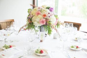 Today, we are featuring a lovely little inspiration shoot with a low-key farm-to-table vibe designed by Evoke Chancy Floral. The arrangements star accents of carrots, flowering kale, artichokes, asparagus, lettuce head, and beets. The table settings offer pops of cherry tomatoes and pittosporum greenery garnish on each guest plate. Savor the inspiration by scrolling down.