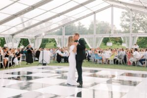 and their spouses rode to the reception in a charming white school bus. Despite the large number of attendees, the couple focused on creating an intimate atmosphere for their reception. They rented a tent, checkered dance floor, and stage from Blue Peak Tents, which included a stunning floral arrangement above the circular bar, and rented a beautiful custom stage backdrop from Cedar & Spice. Event Essentials also provided many pieces to tie everything together. Guests enjoyed a variety of lawn games and playful activities that brought out their inner child, all set against a backdrop of stunning views.